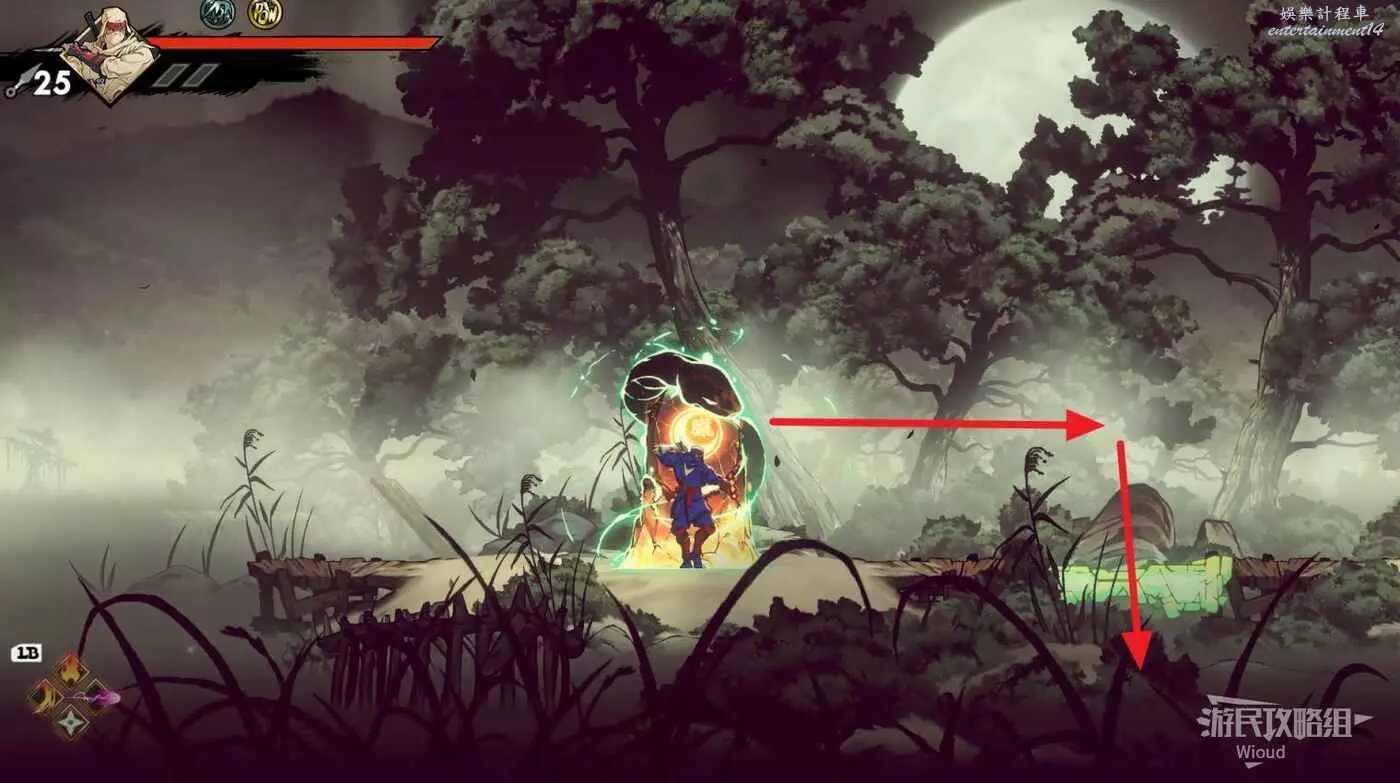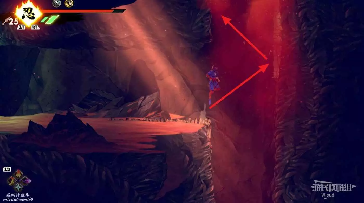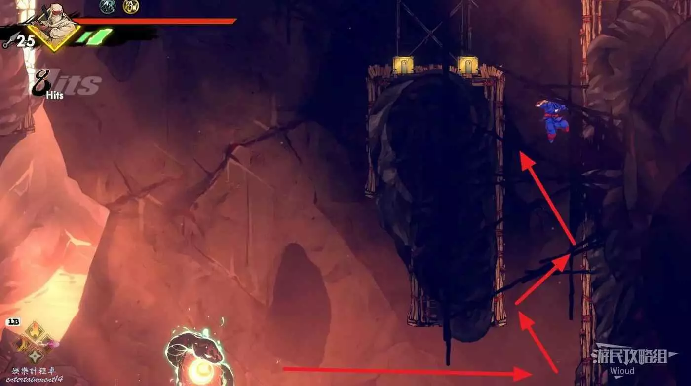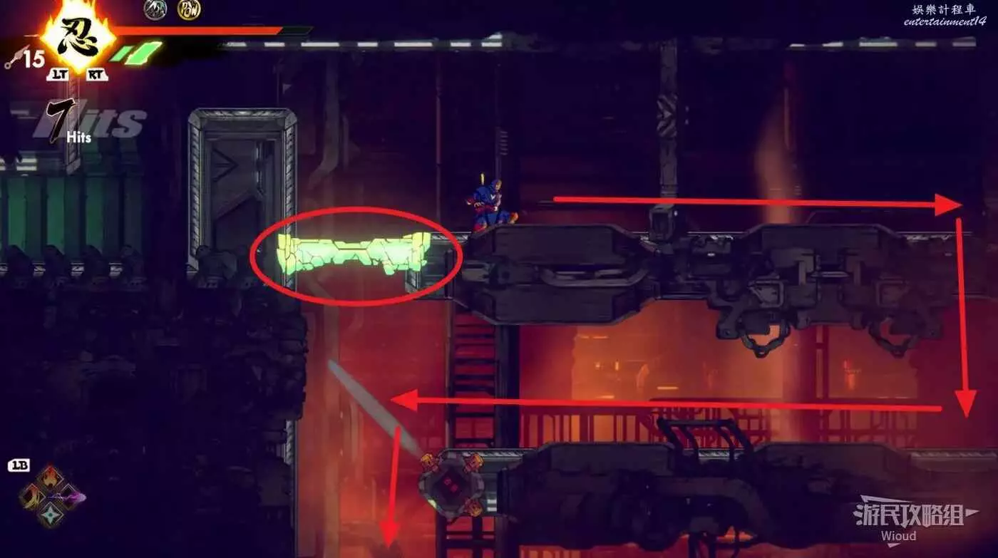 上面是一個開闊區域,擊敗刷出的所有怪物,沿著下圖箭頭跳到左上角再從週邊跳到右邊的區域。
