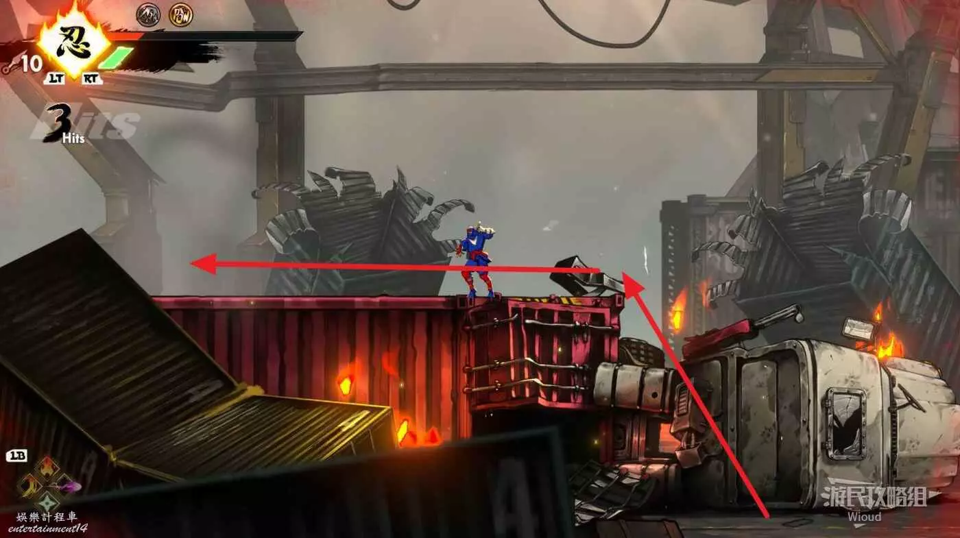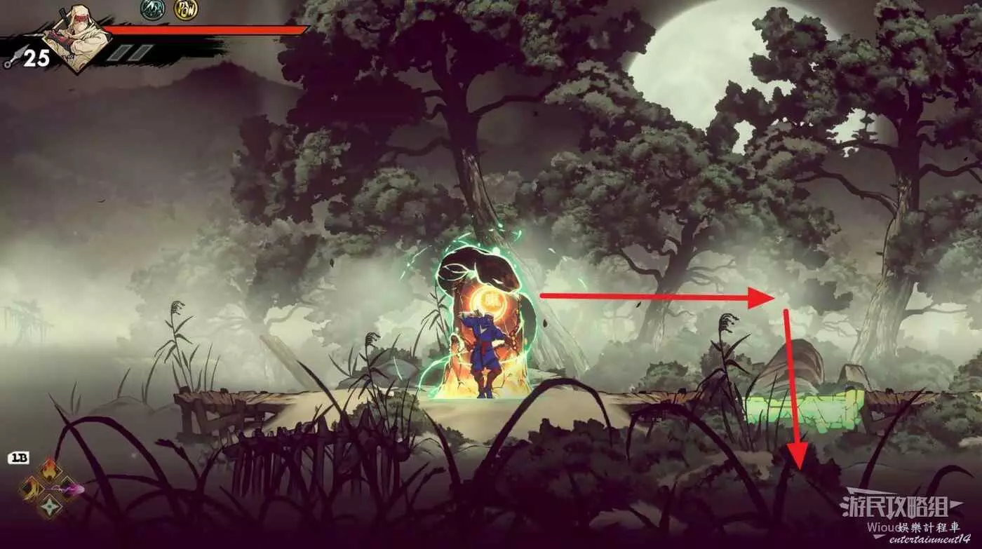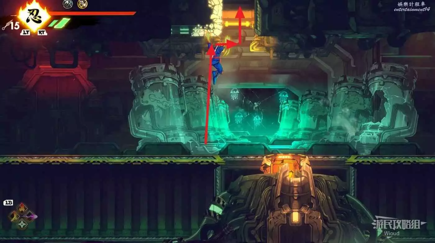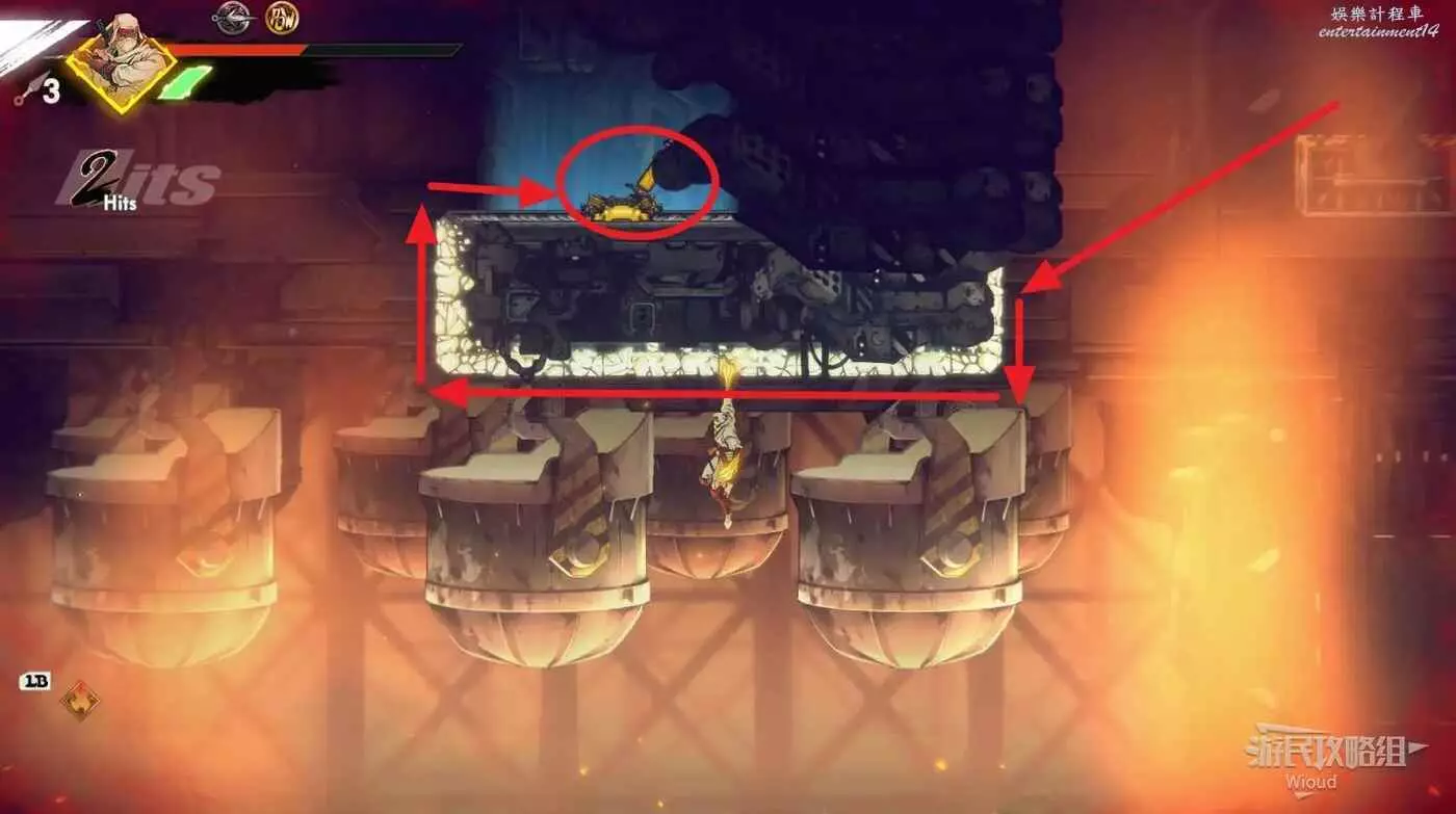 上面是一個開闊區域,擊敗刷出的所有怪物,沿著下圖箭頭跳到左上角再從週邊跳到右邊的區域。