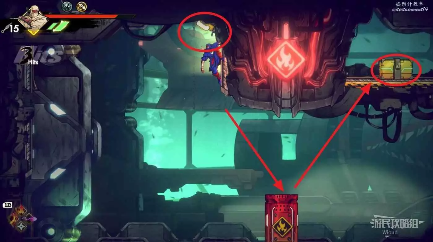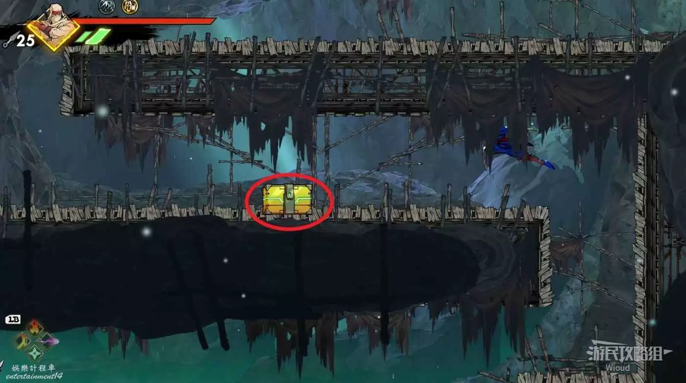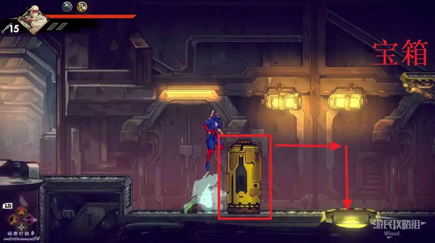 然後從右邊往下跳,直到落在最底部偏右的平台上,跳到底部右側的黃色標誌1位置,裡面藏著三個容易漏掉的寶箱。