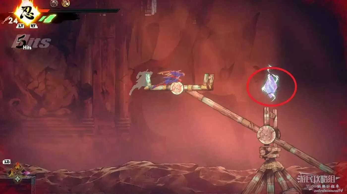先沿著紅色路線走,重點紫色陷阱位置需要配合柱子出來的順序折返跳,盡頭寶箱可獲得【朧珠】。