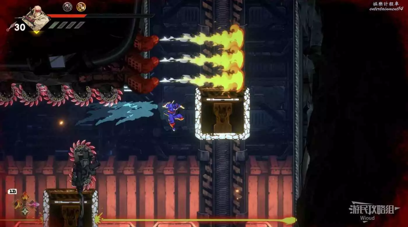方塊會立刻往噴火的位置上升,需要立刻貼到方塊左邊的可抓爬牆壁上,經過第一段陷阱立刻移動到方塊頂部,完事再爬到左邊牆壁。