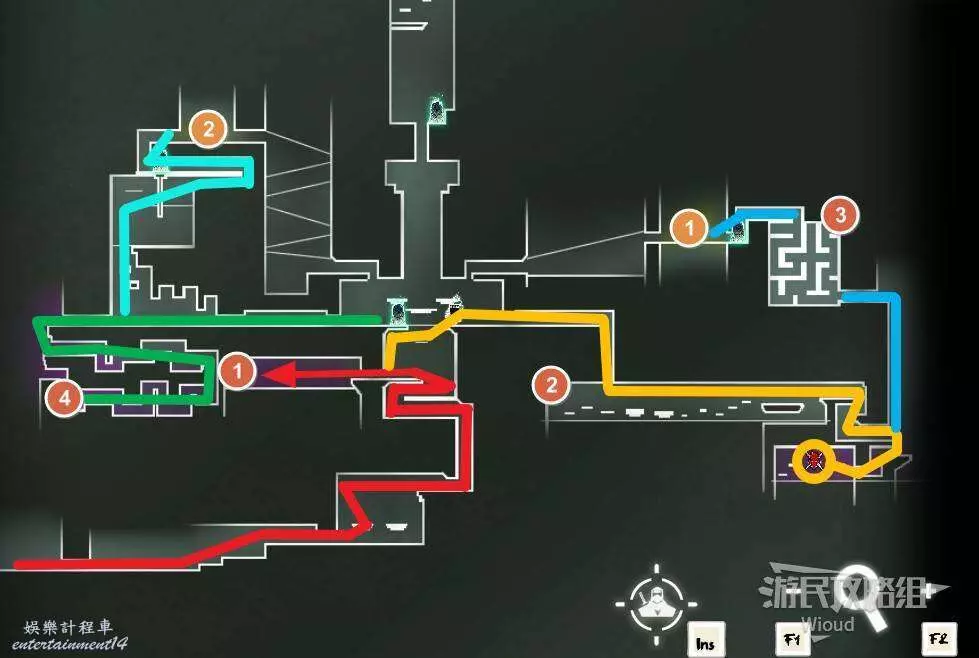 回到開闊區域,右牆中間的門是鎖住的,需要沿著下圖路線先沿著右側走到頂層再往左走,頂層左側盡頭紅色標點1的位置會找到一個機關,攻擊後下落到黃色標點1的位置,此處有一個容易漏的寶箱。