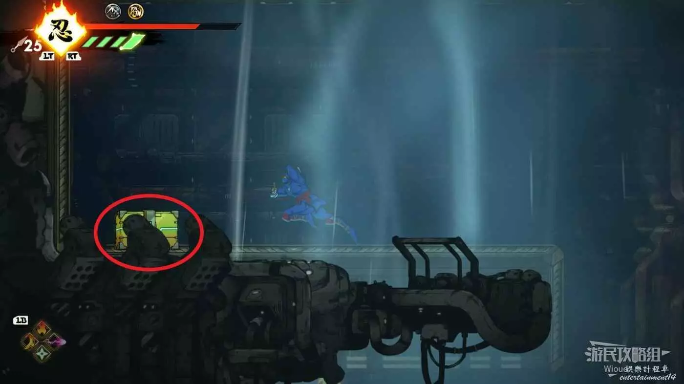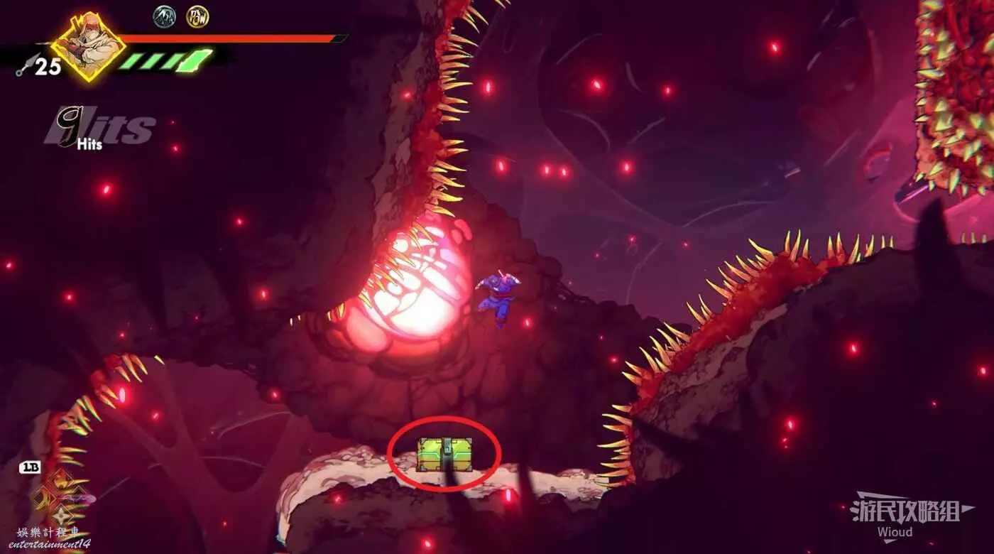 回去往上爬,左上角看見一個忍者敵人時,它的右側平台有一個能回血的箱子。