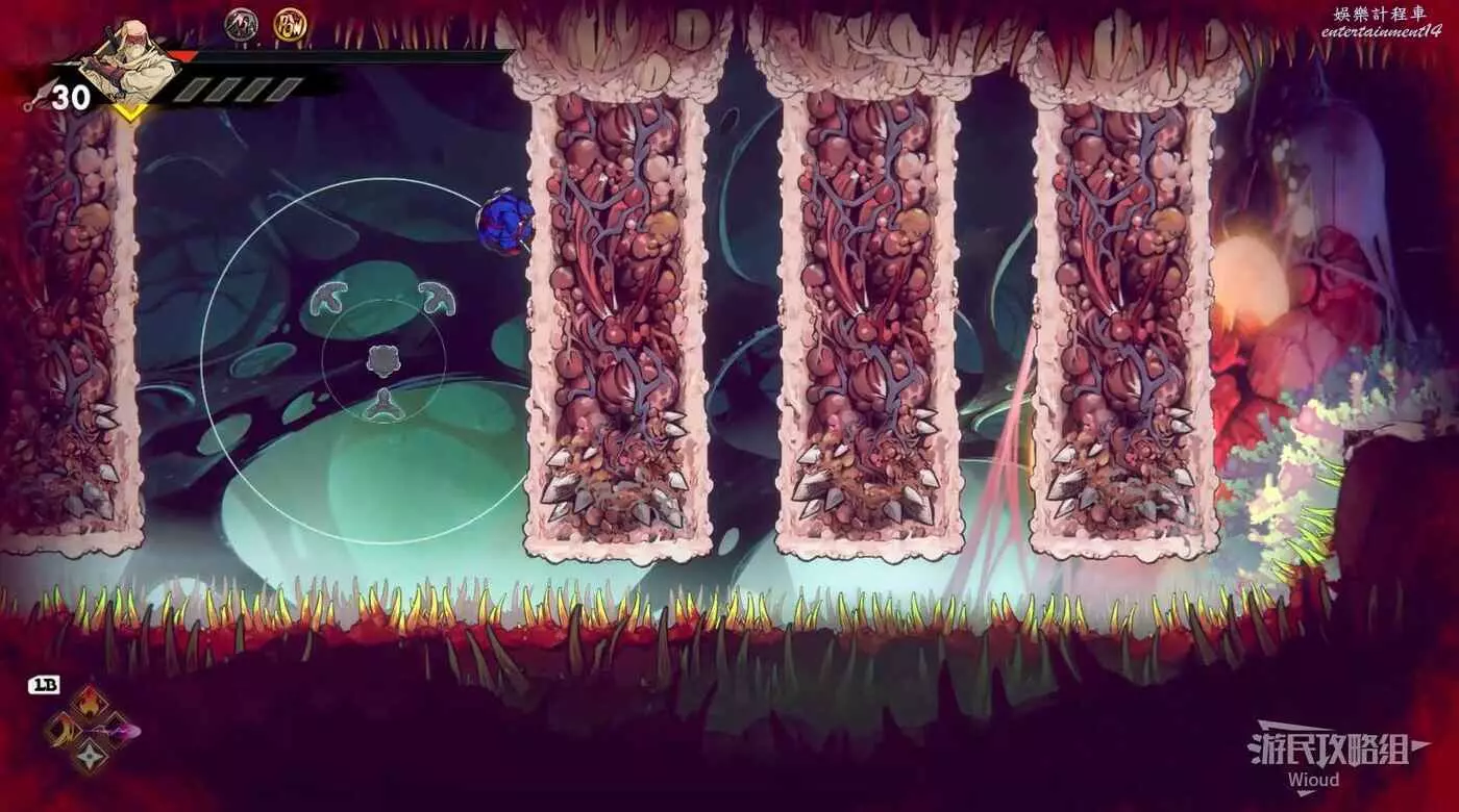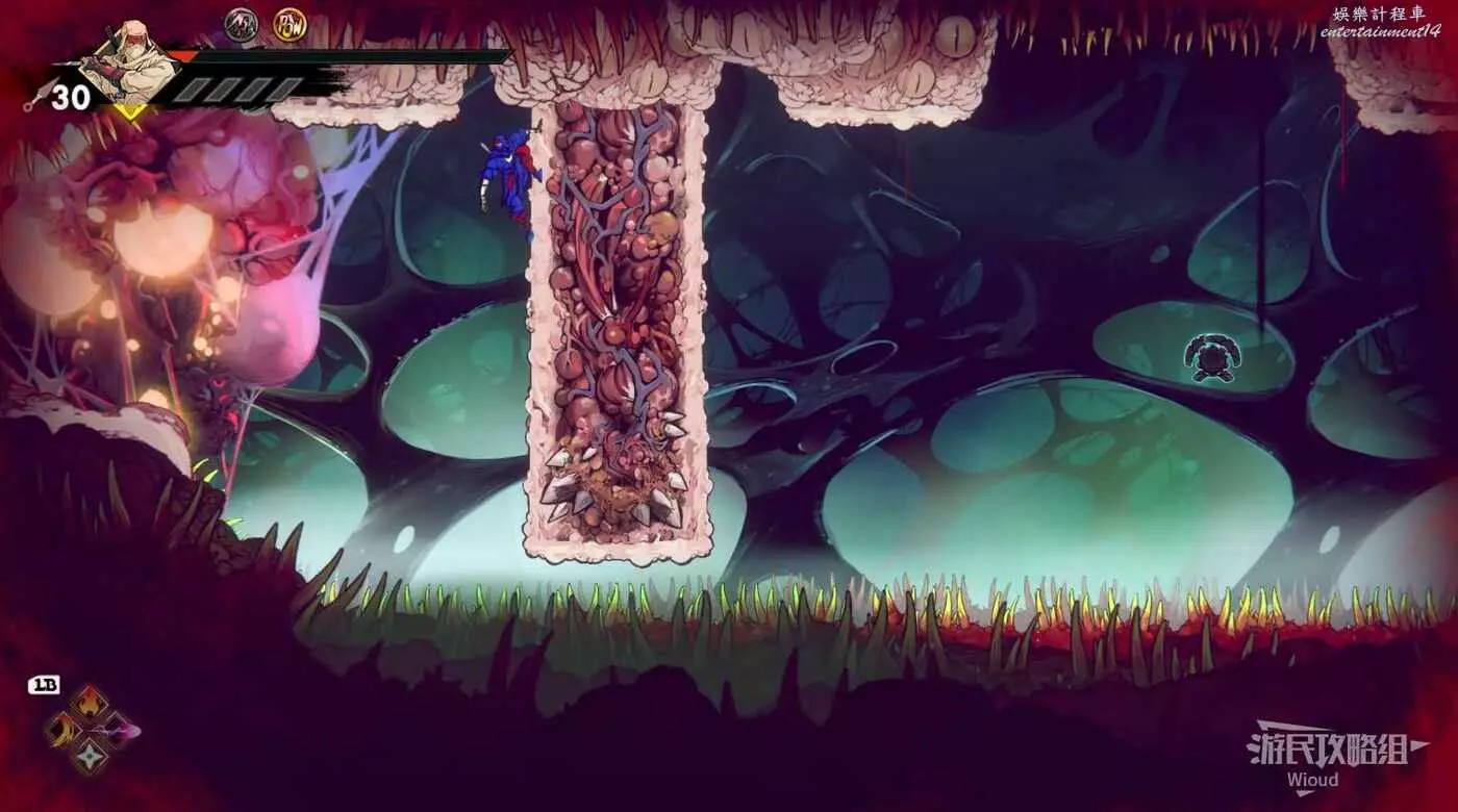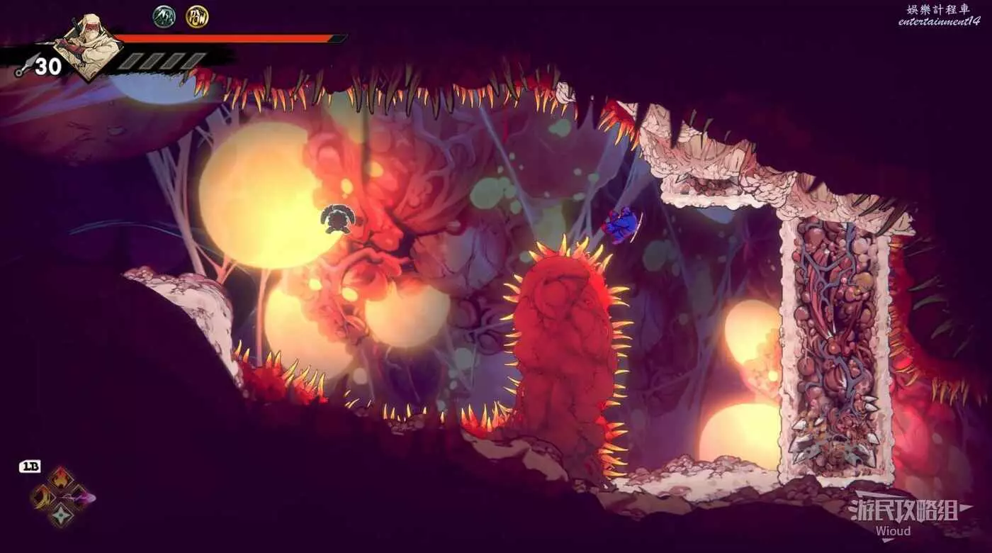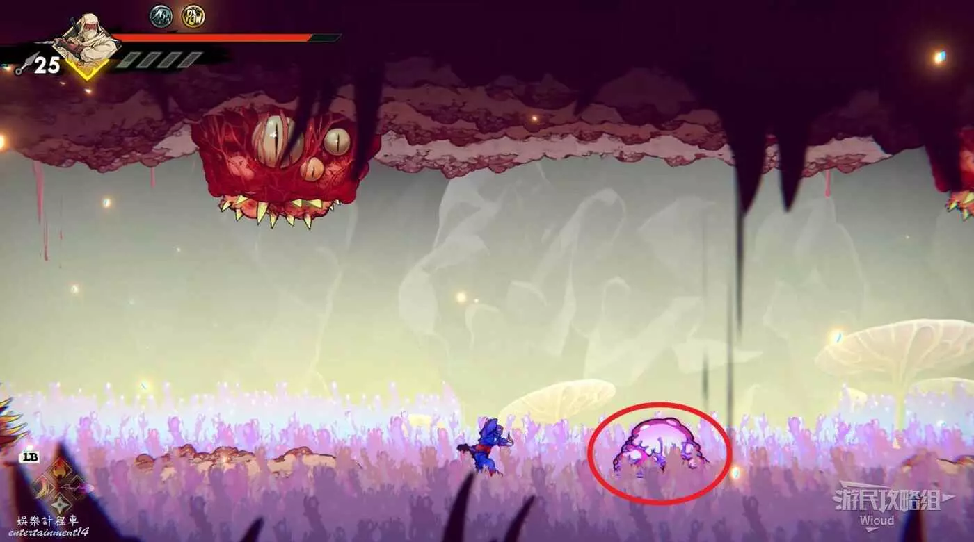 注意石碑旁繼續往下走的路被幾條絲線擋住了,我們需要破壞幾個膿皰才能繼續前進。