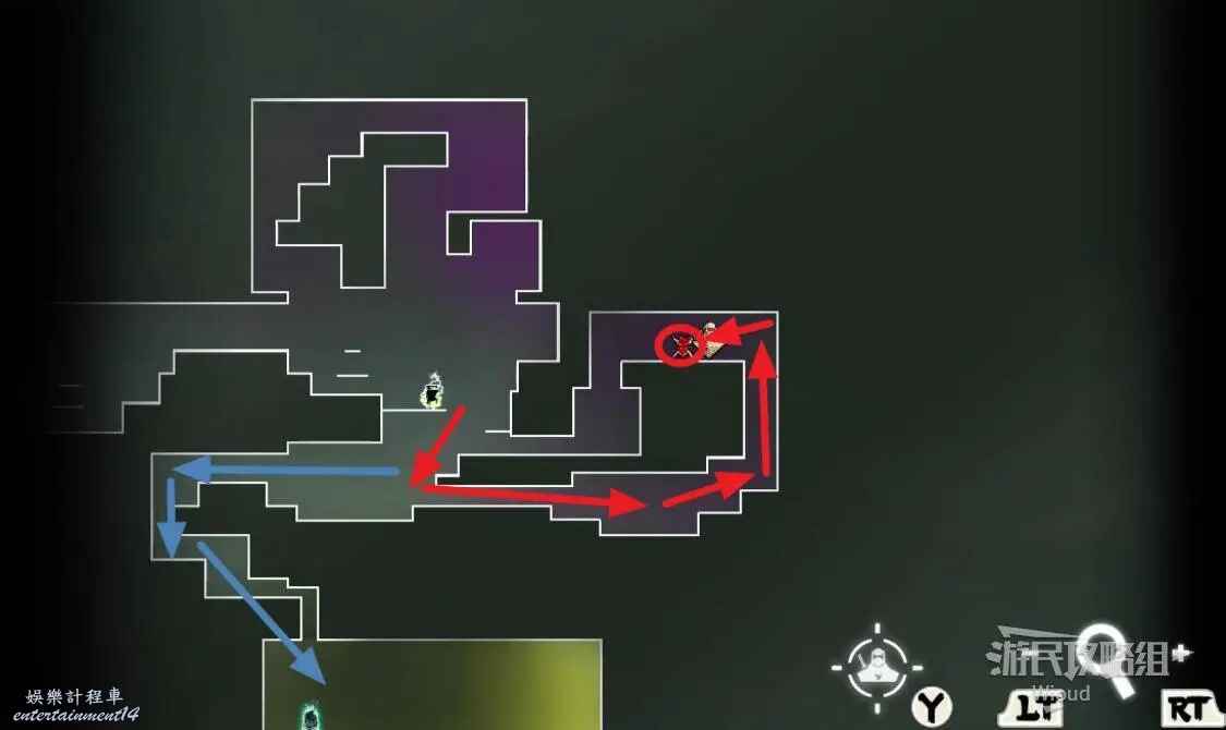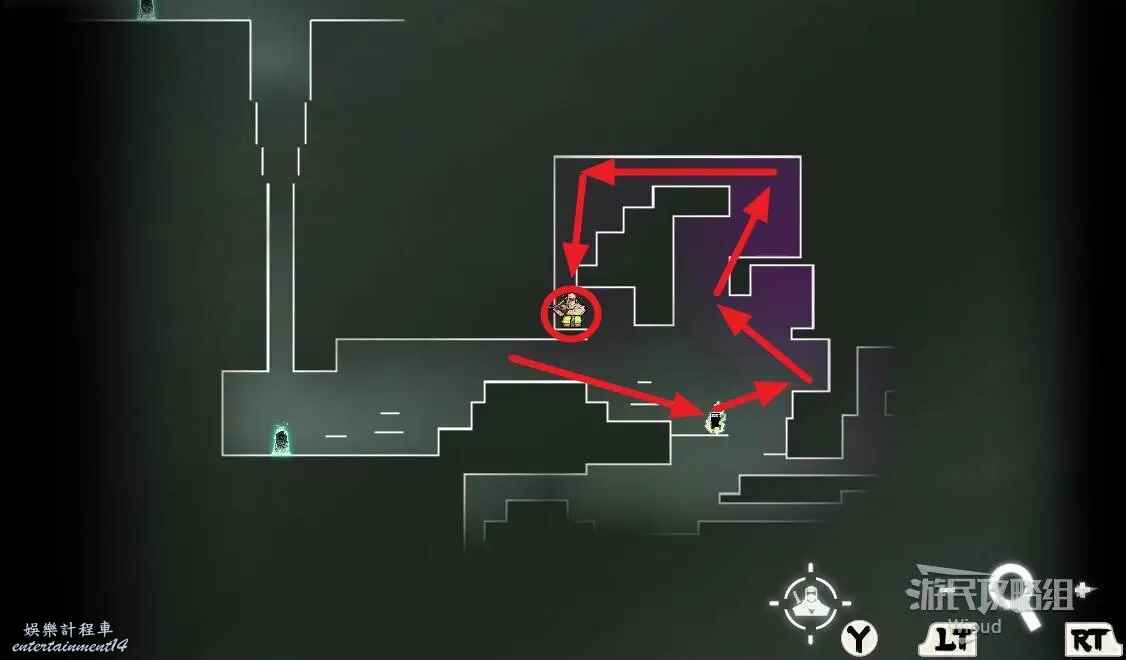 繼續沿著下圖紅色箭頭走右側通道,繞到上層會找到最後一支【精英部隊】。