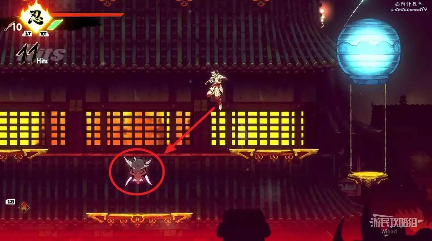 完成精英部隊的挑戰後,通過右邊的燈籠把手跳到右側第一個屋頂上,注意藍色燈籠可隨意使用,但紫色燈籠玩家站立時會慢慢往下降落,在一些機關處降落到低點會直接死亡。