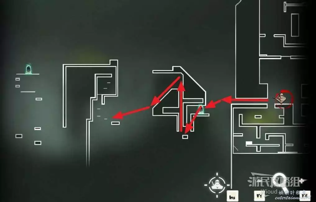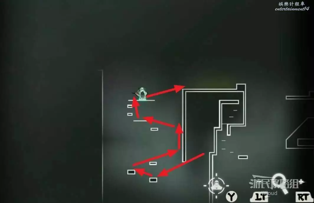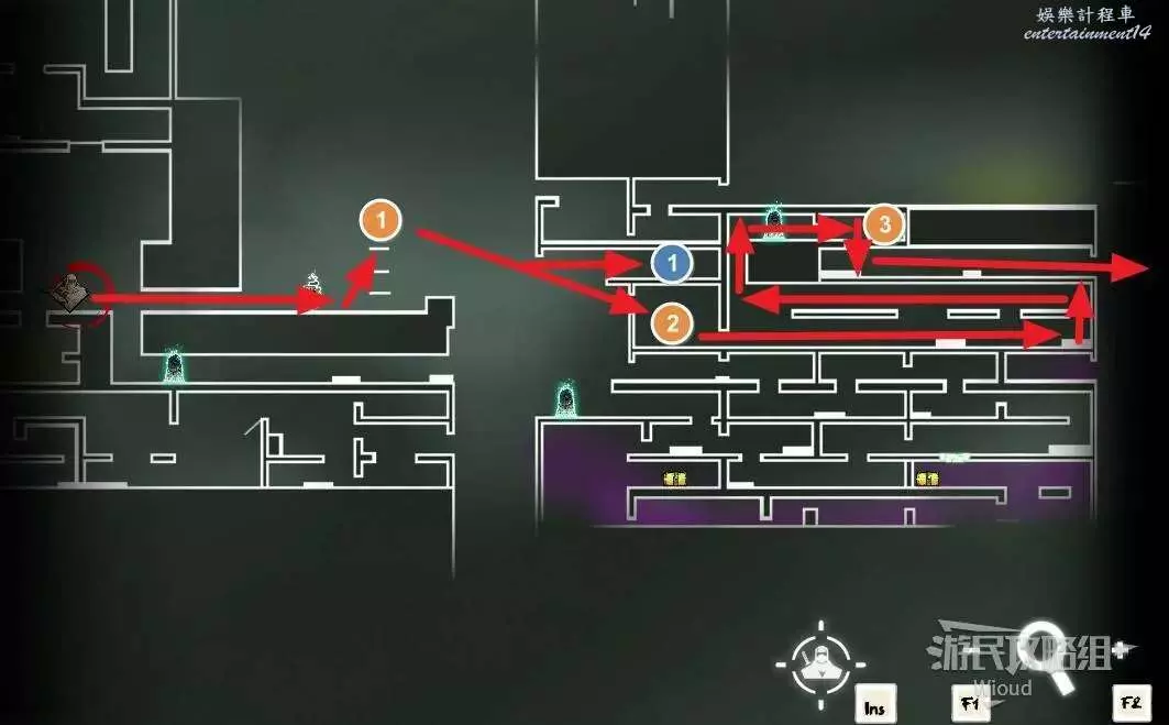 從起始點出發,沿著下圖紅色箭頭往右走,黃色標識代表寶箱,藍色標識代表精英部隊。