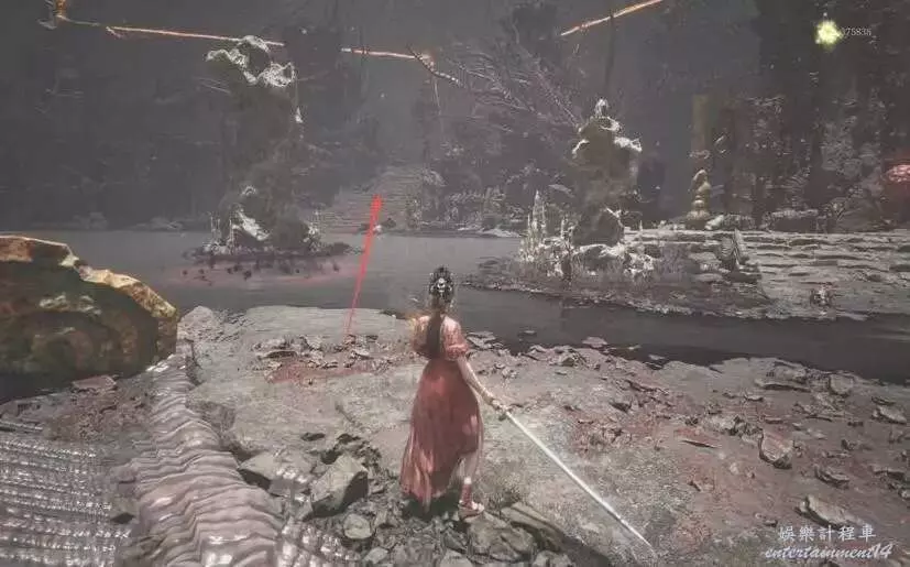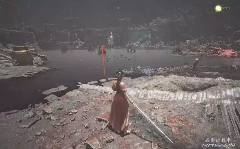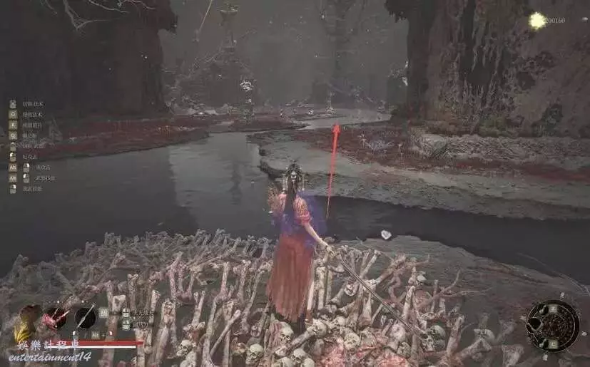 直接向前跑,然後右拐上階梯,去啟動機關,可以關閉“失心炮”,並且為水潭架起浮橋。注意水潭裡有“腐化debuff”效果。