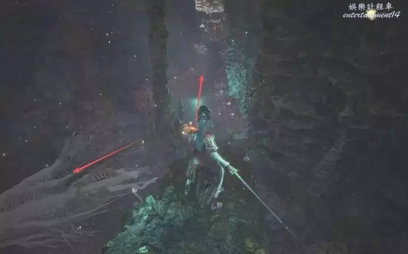 過浮橋,往前走,看到有花形狀怪物的地方,跳下去(箭頭所指有個老六)。