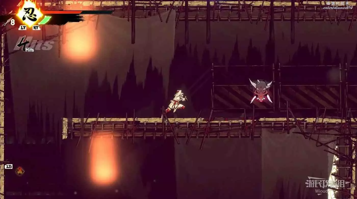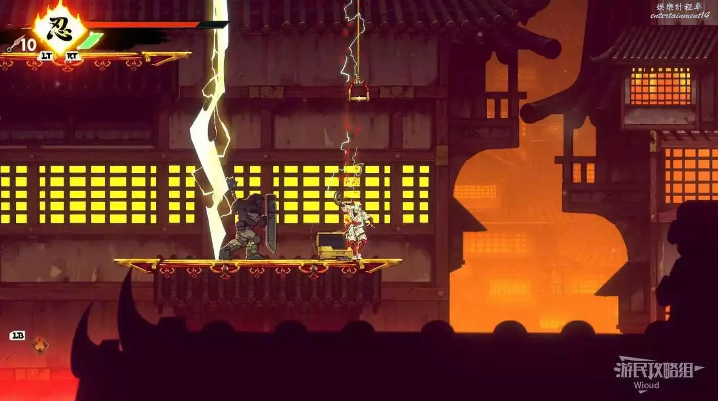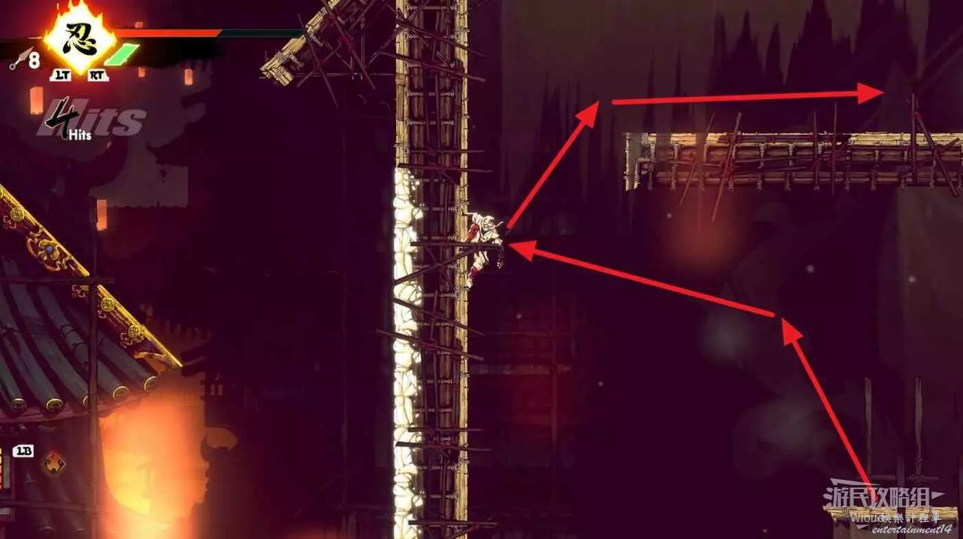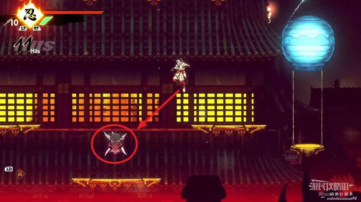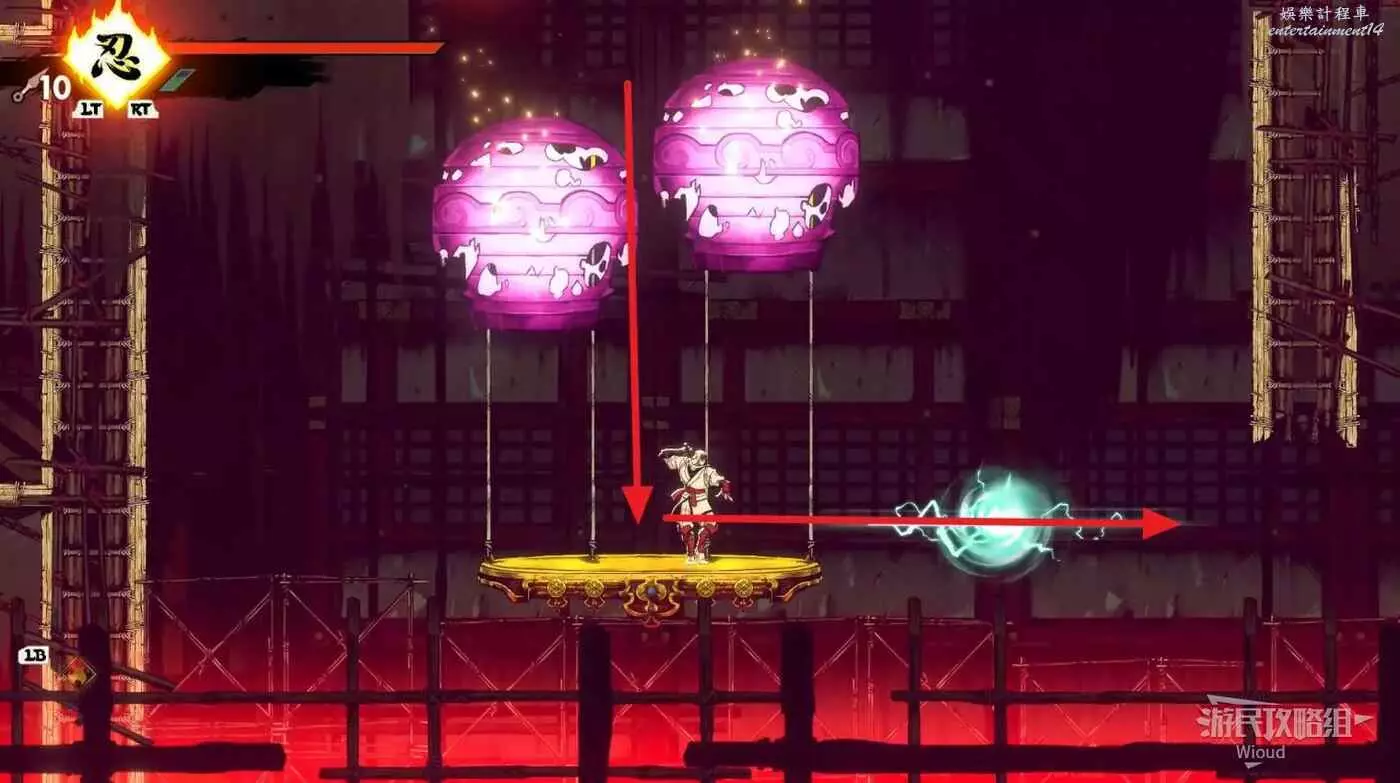 完成精英部隊的挑戰後,通過右邊的燈籠把手跳到右側第一個屋頂上,注意藍色燈籠可隨意使用,但紫色燈籠玩家站立時會慢慢往下降落,在一些機關處降落到低點會直接死亡。
