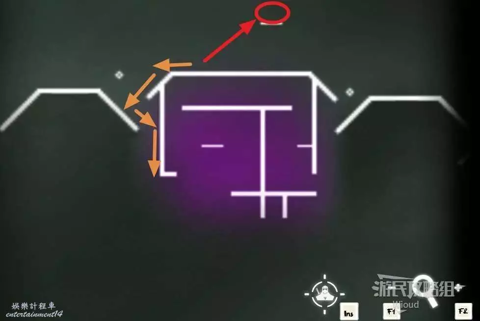 往右走到第四個屋頂上,地圖看這個屋頂下方是發紫的。