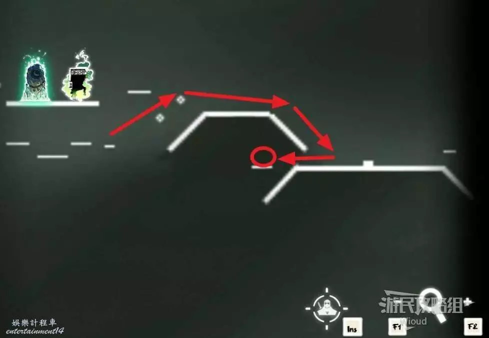 石碑位置沿著下圖路線往正下方平台移動,會發現第一個【精英部隊】,攻擊鬼頭圖示會刷幾波怪。