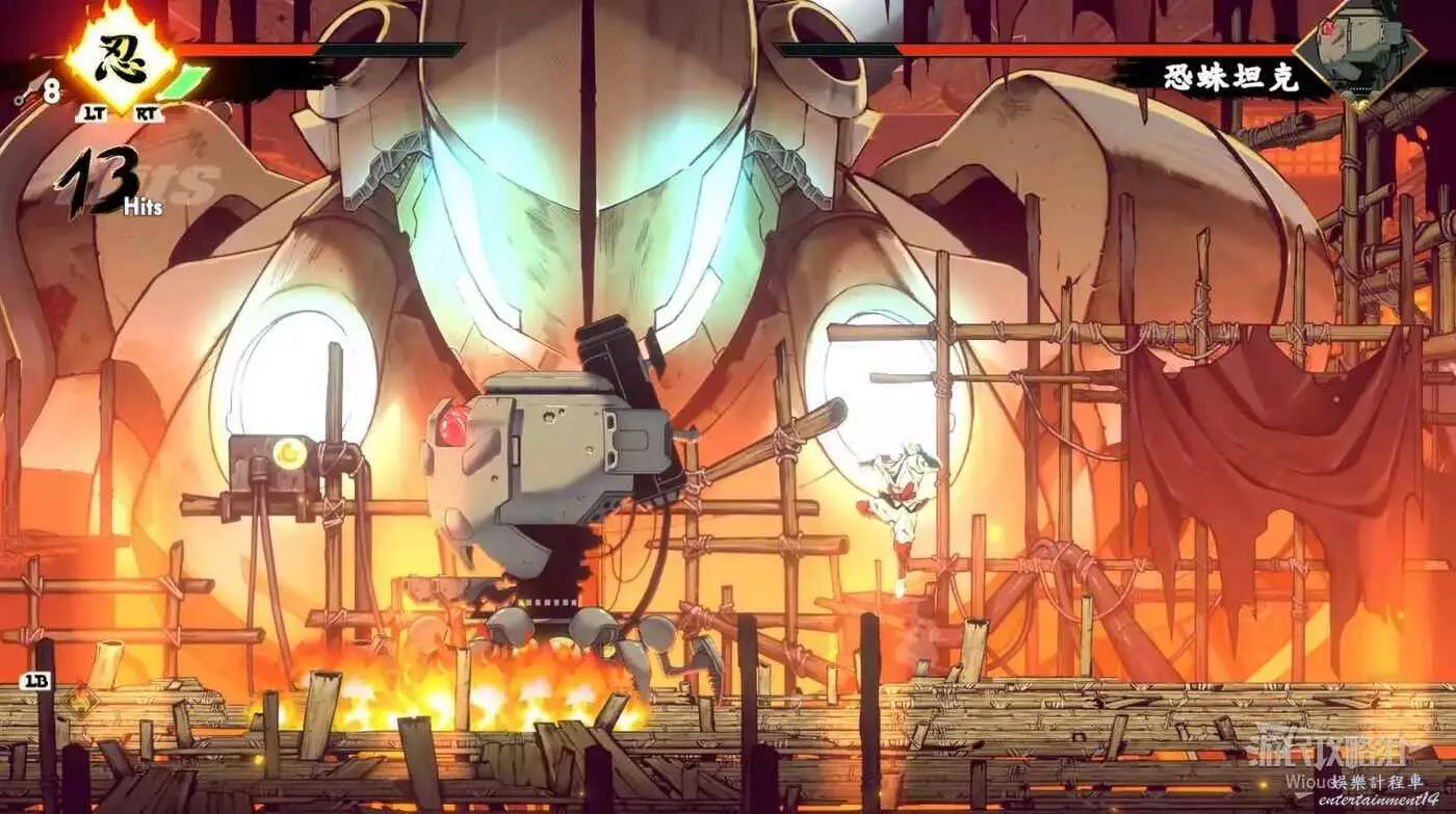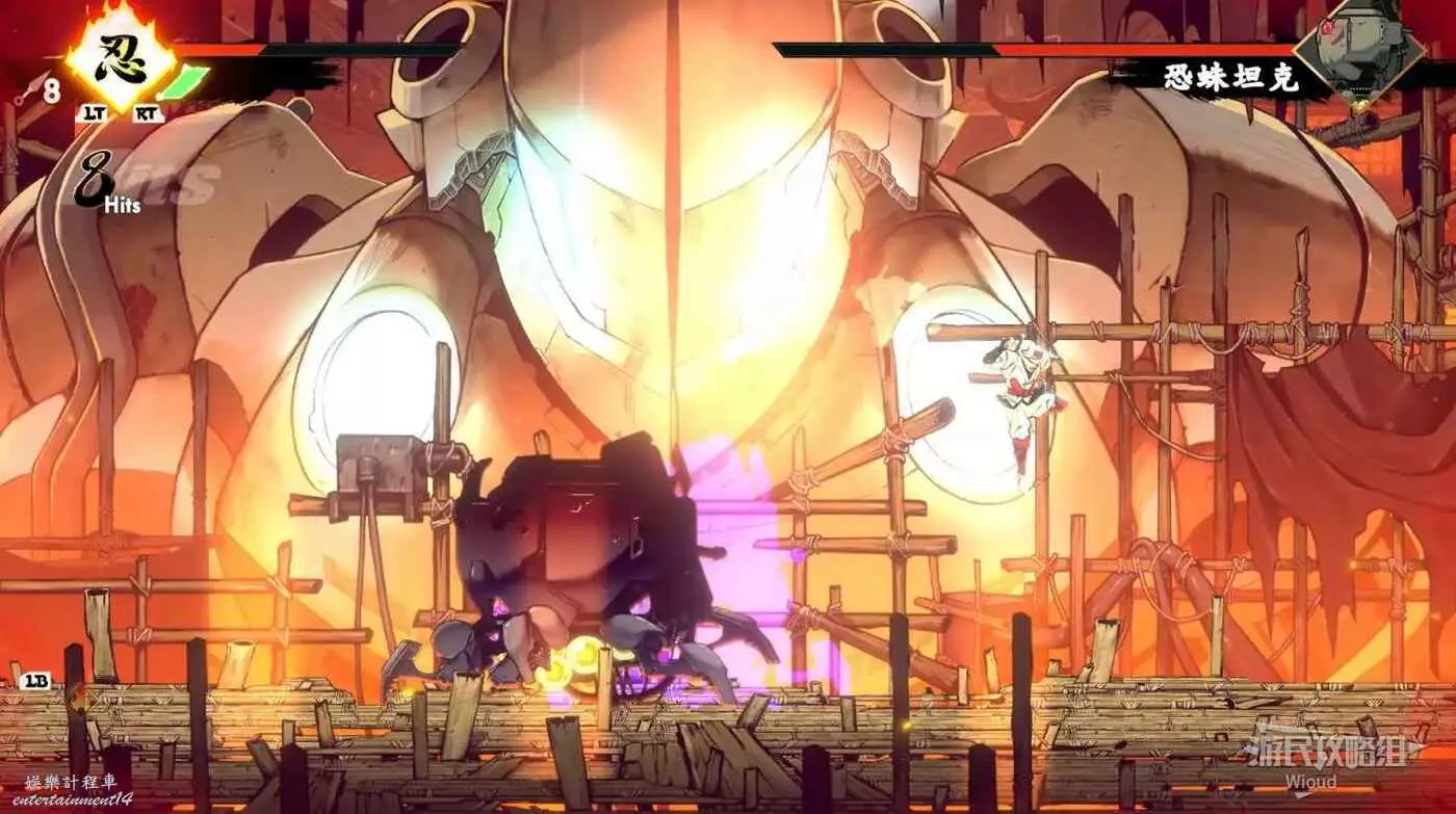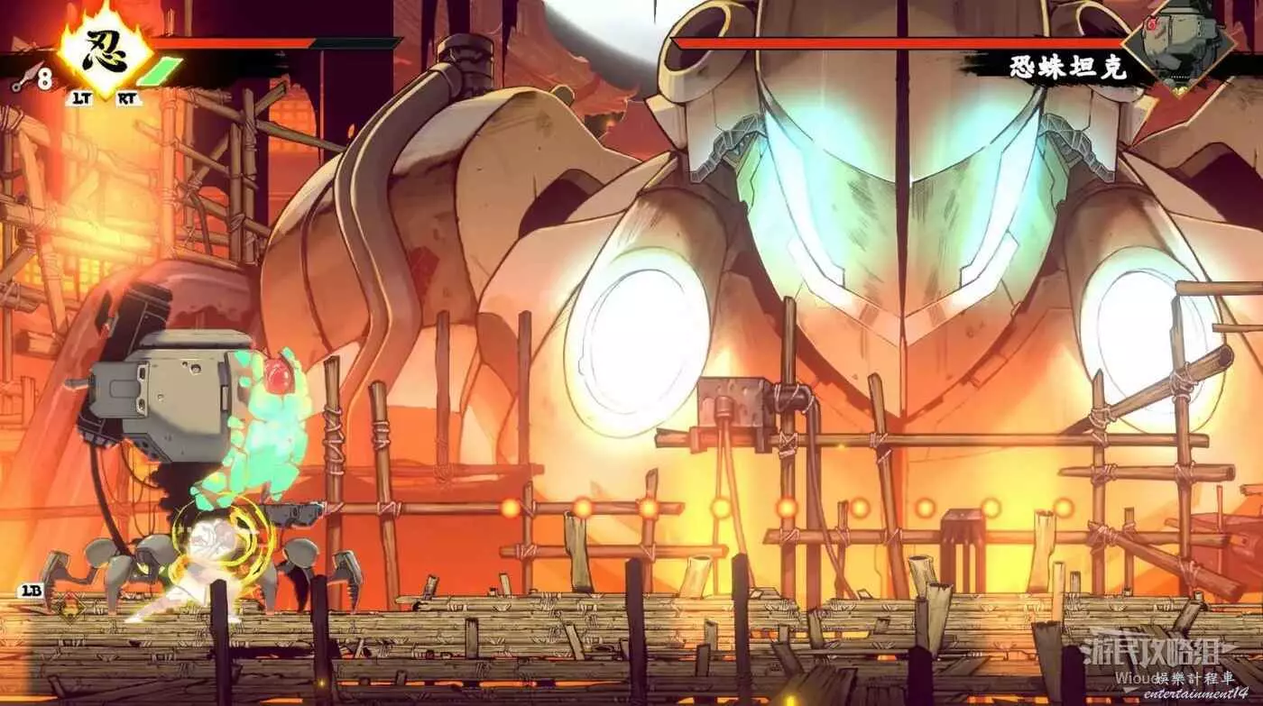 第二種紫色攻擊它會先朝地面射出鐳射然後逐漸上抬角度,因為鐳射會先朝地面射擊一段時間,看到鐳射立刻跳躍移動到另一側在背面攻擊BOSS即可,將BOSS擊敗可獲得【忍法·雷閃】。