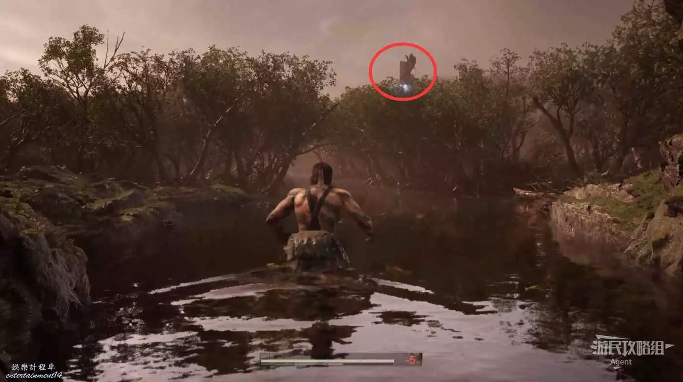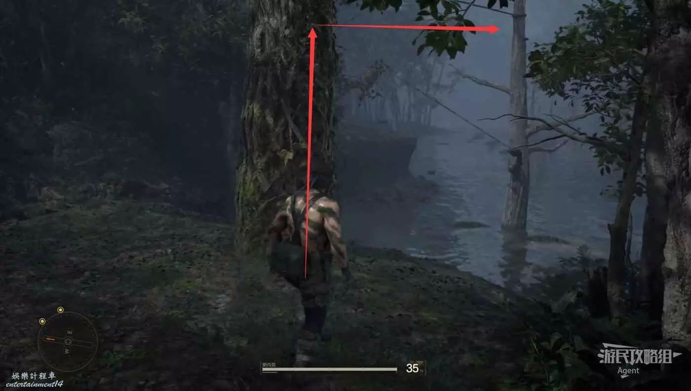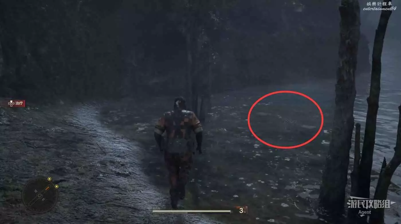 往前走遇到頭領和她的馬,劇情後先往南走,穿過鱷魚沼澤,回到遊戲最開始的懸崖邊,撿到手榴彈、眩暈手榴彈、干擾手雷。