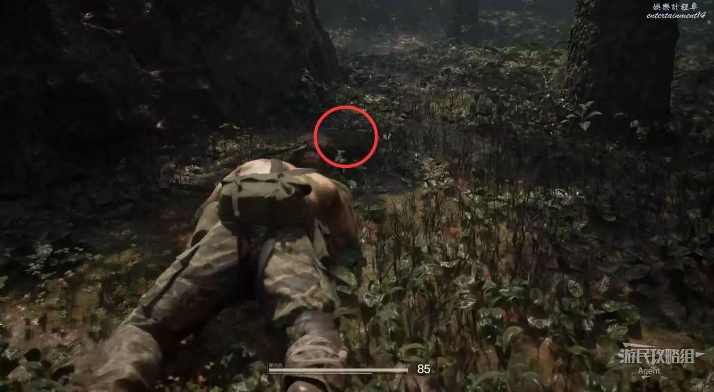 往北走來到沼澤,小心鱷魚。鱷魚附近也有物資可撿,右邊的鱷魚旁可撿到手榴彈。