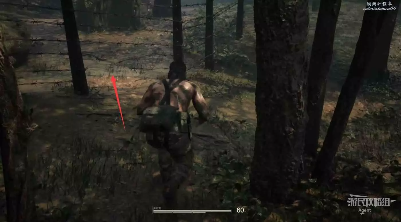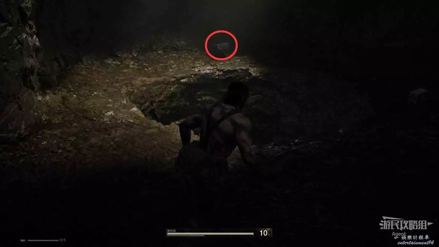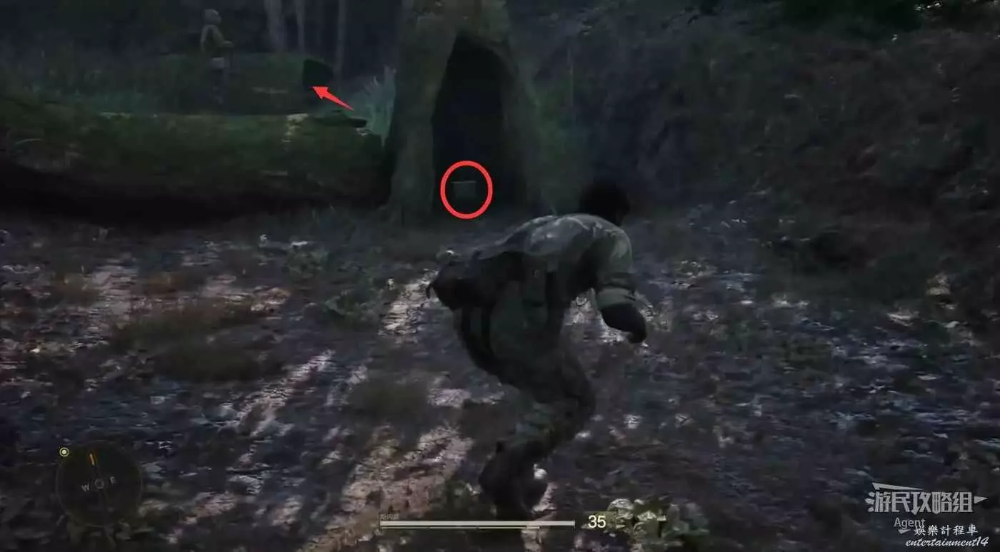 走過吊橋後,去橋頭左側下方的洞,拿到煙霧彈等物資。