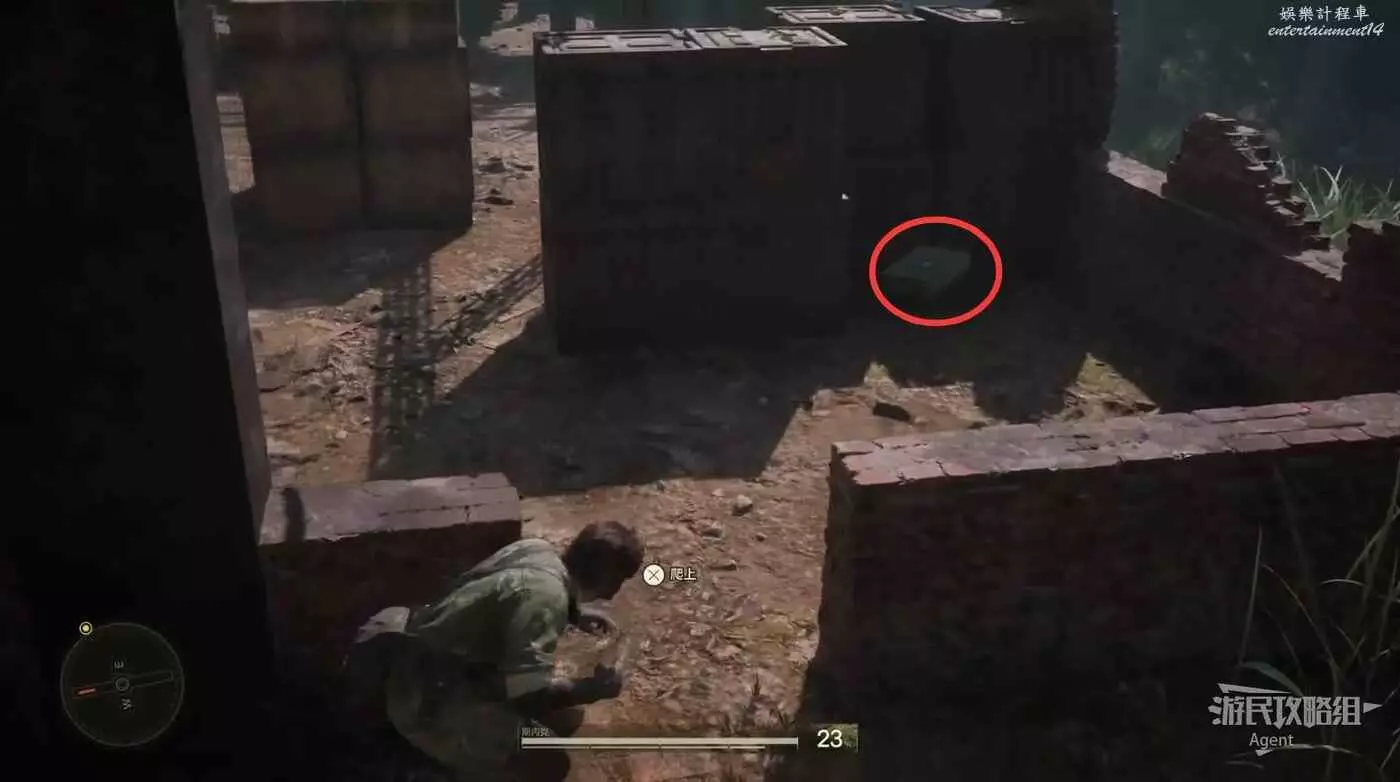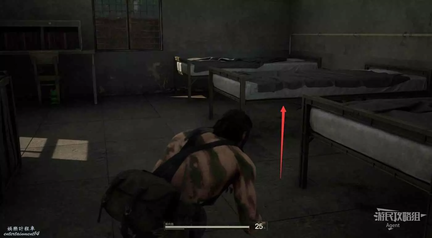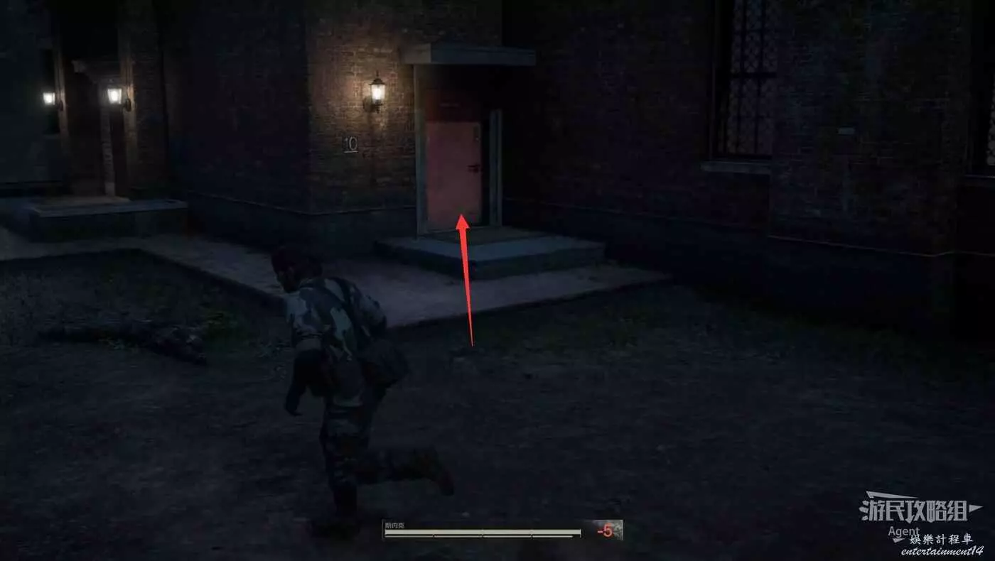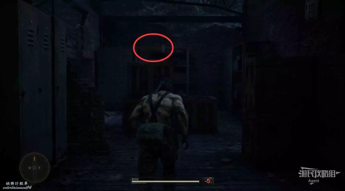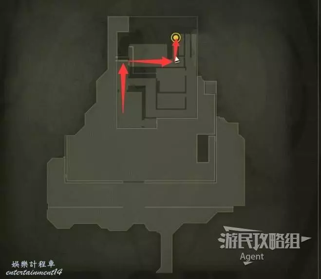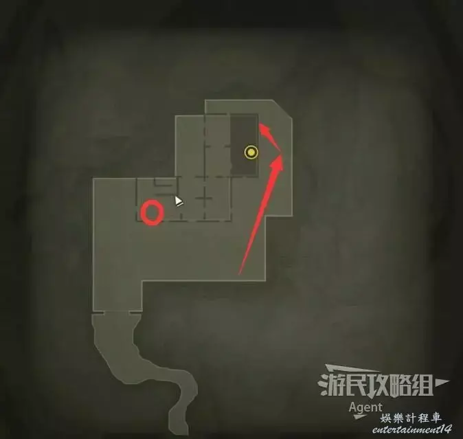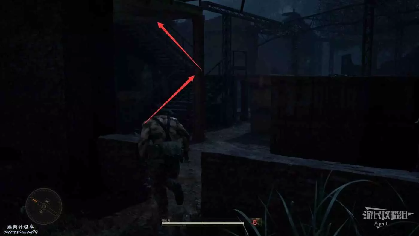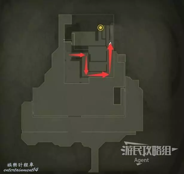 沿下圖路線,爬上右側牆壁上的梯子到房頂,從房頂的洞下去可直接抵達目的地房間觸發劇情。