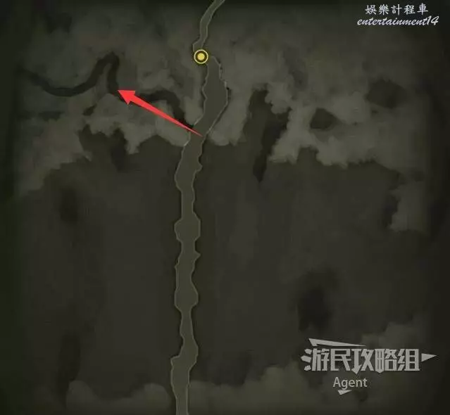 按下圖箭頭方向,到地圖中間看到兩個瀑布。在兩個瀑布之間的洞裡,拿到松明火把。