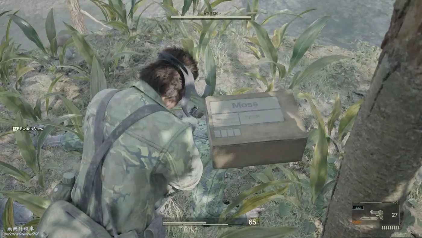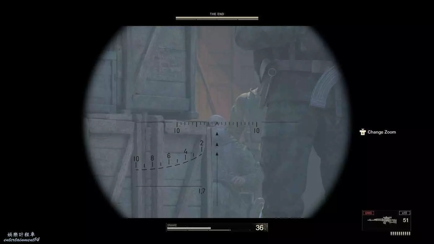 此處有許多收集道具,但重點是在右側建築內拿到狙擊步槍,由一名攜帶8mm膠片的士兵看守,獲取膠片難度較高。如果不考慮膠片的話,只需快速將兩名守衛擊暈或擊敗,進入建築拿到狙擊步槍以及其他武器道具。