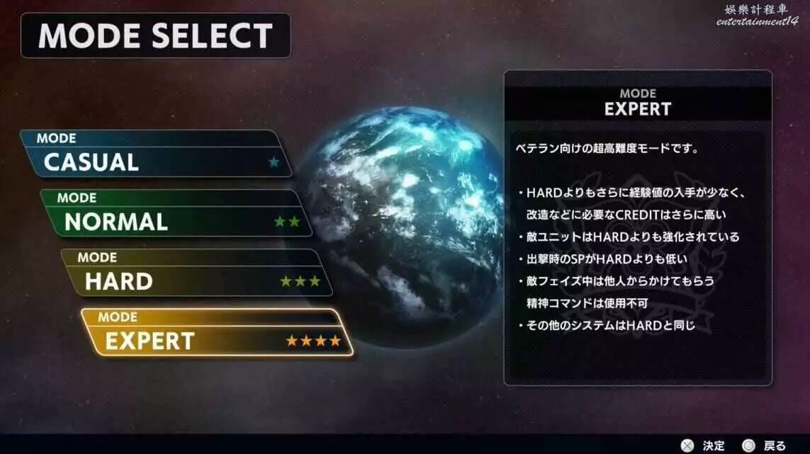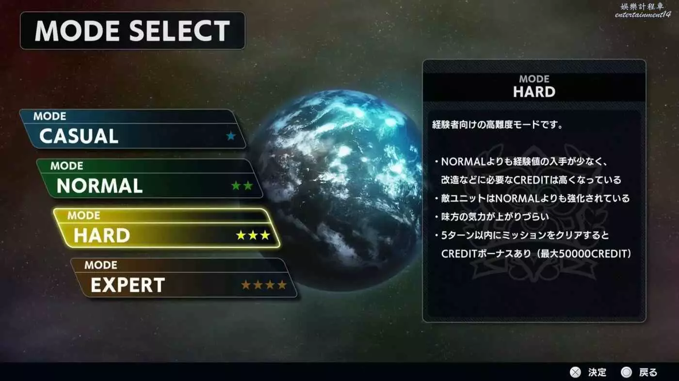 難度提升後,敵方單位會更強,我方SP恢復效率降低,戰鬥挑戰性顯著增加。困難(HARD)和專家(EXPERT)模式下敵方單位的改造段階和駕駛員能力都會提升。