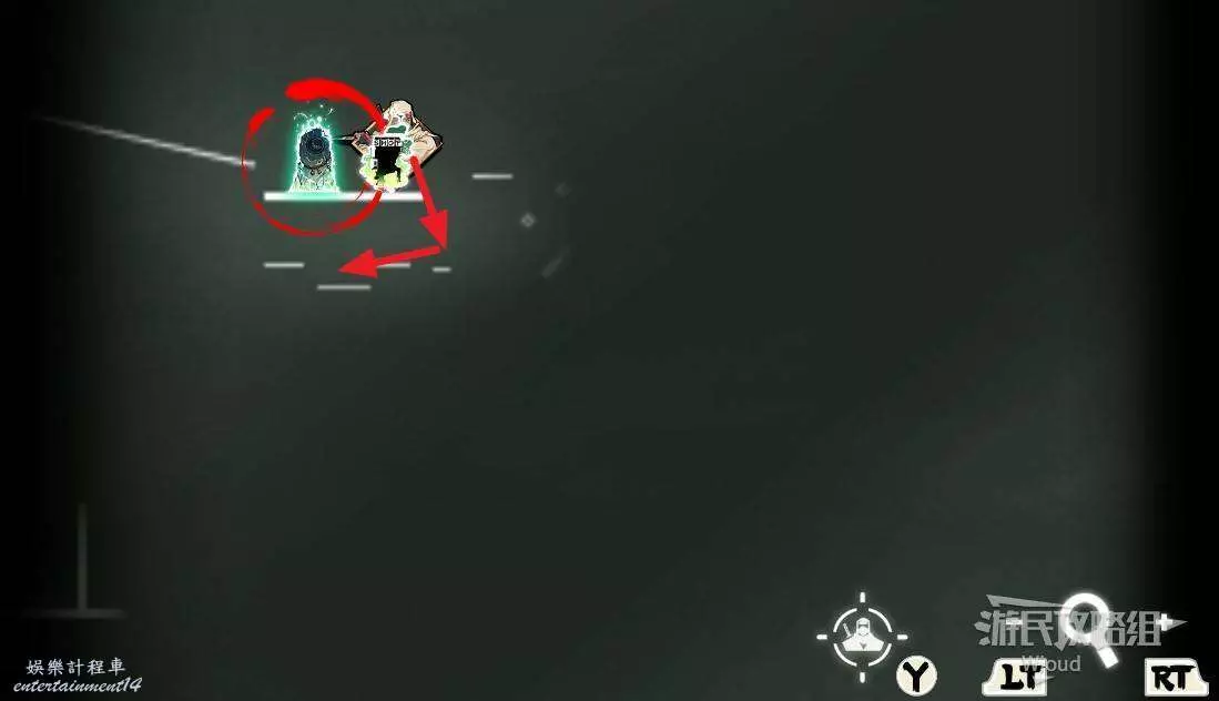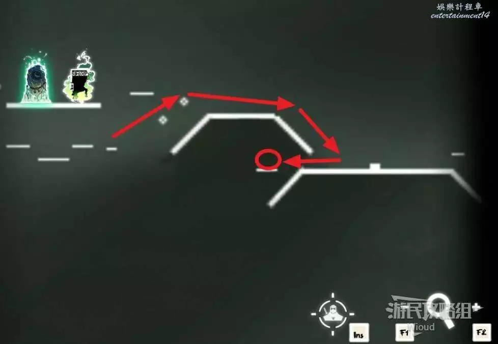 石碑位置沿著下圖路線往正下方平台移動,會發現第一個【精英部隊】,攻擊鬼頭圖示會刷幾波怪。