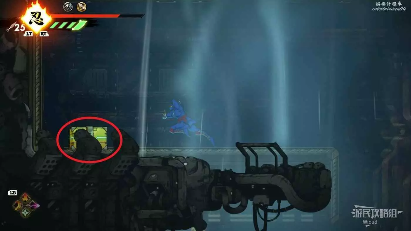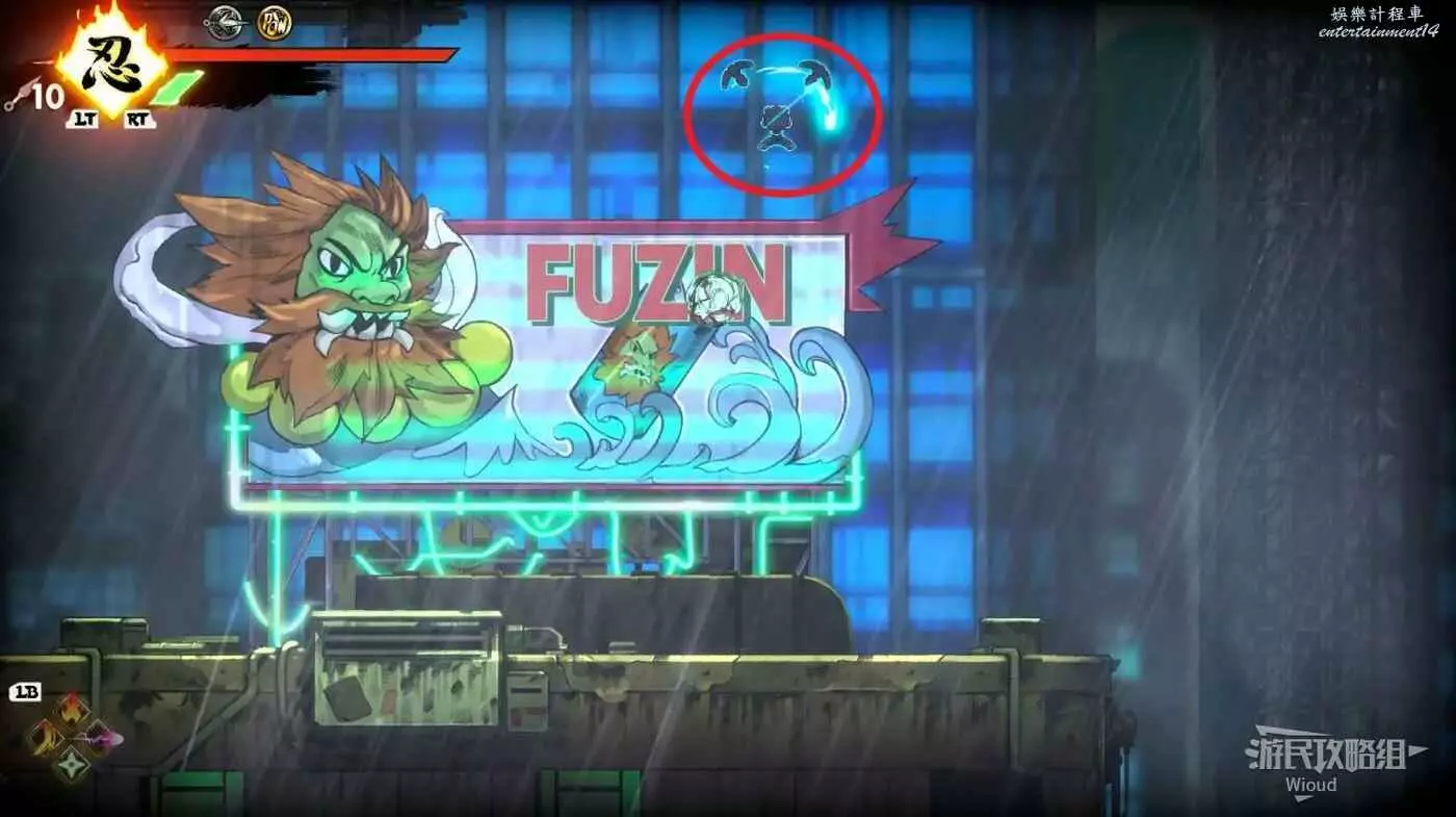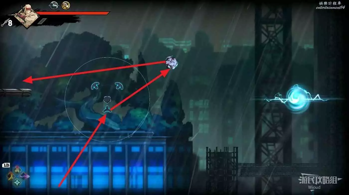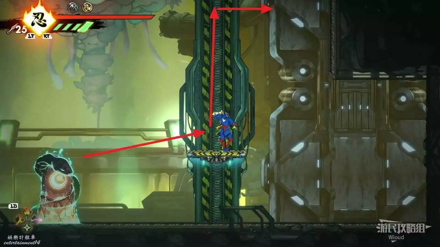 完成精英部隊的挑戰後,通過右邊的燈籠把手跳到右側第一個屋頂上,注意藍色燈籠可隨意使用,但紫色燈籠玩家站立時會慢慢往下降落,在一些機關處降落到低點會直接死亡。