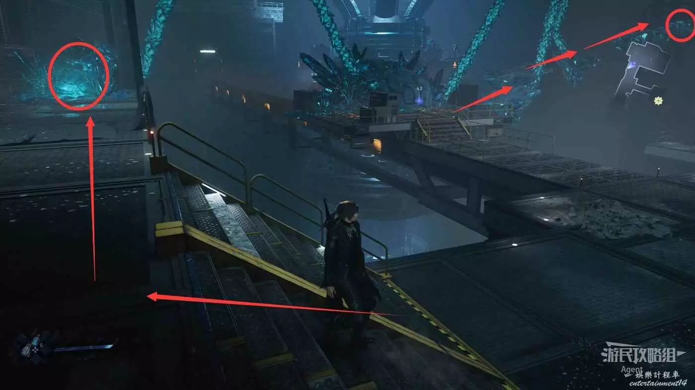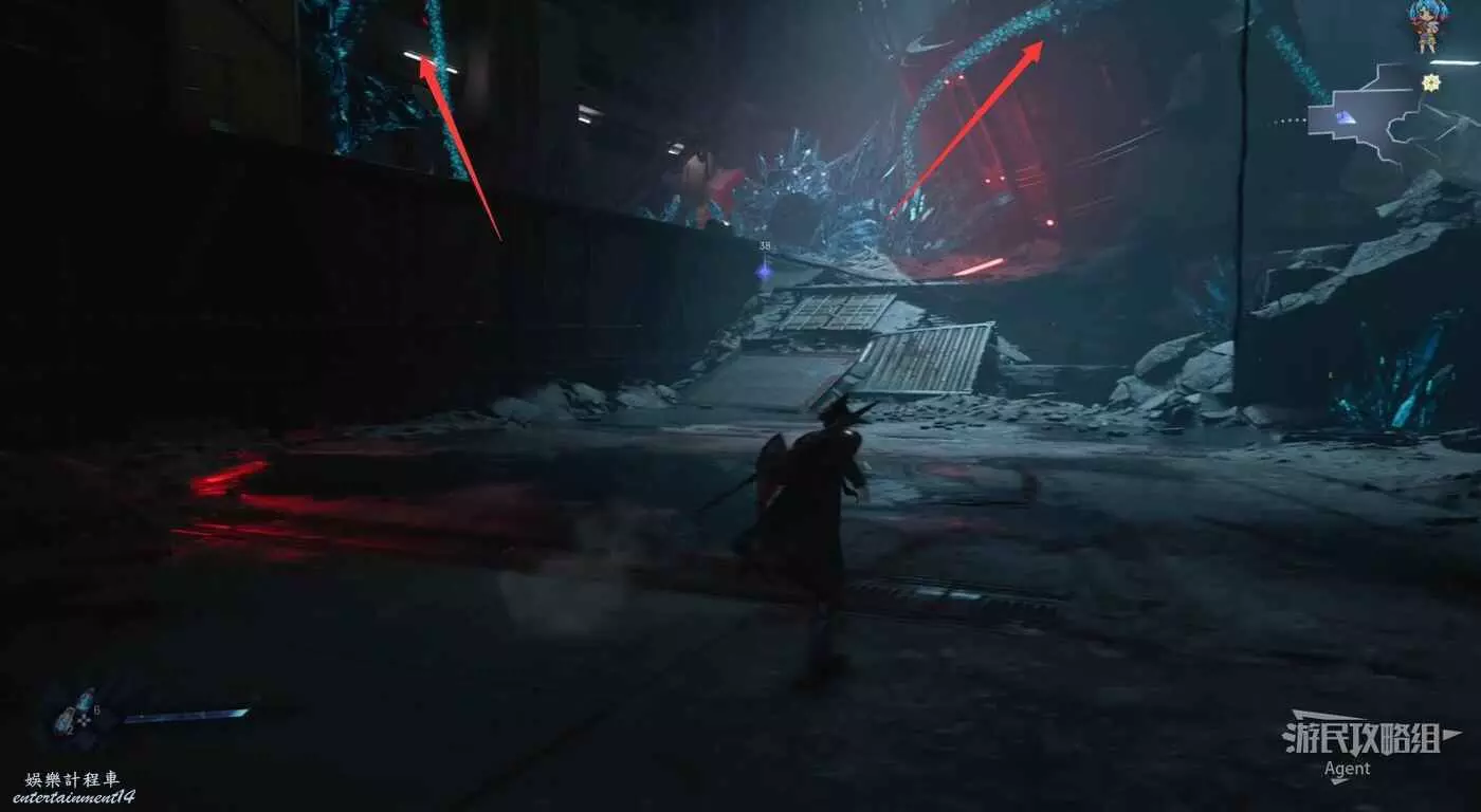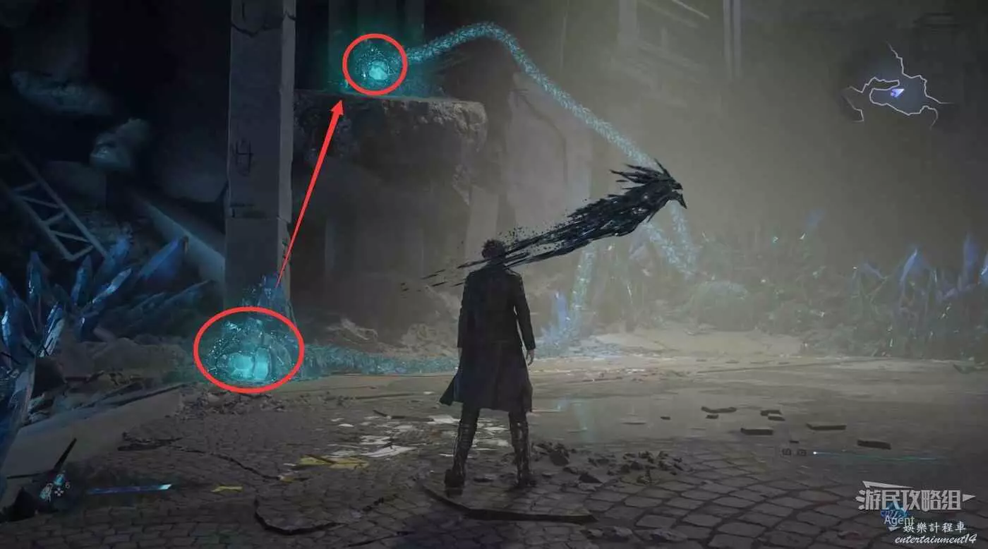 注意看水晶線,順著線找到兩側的水晶摧毀。摧毀右邊水晶後面有寶箱,左邊的水晶在高處需要一層層跳上去。