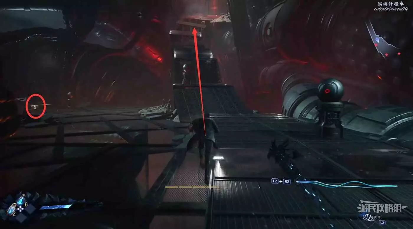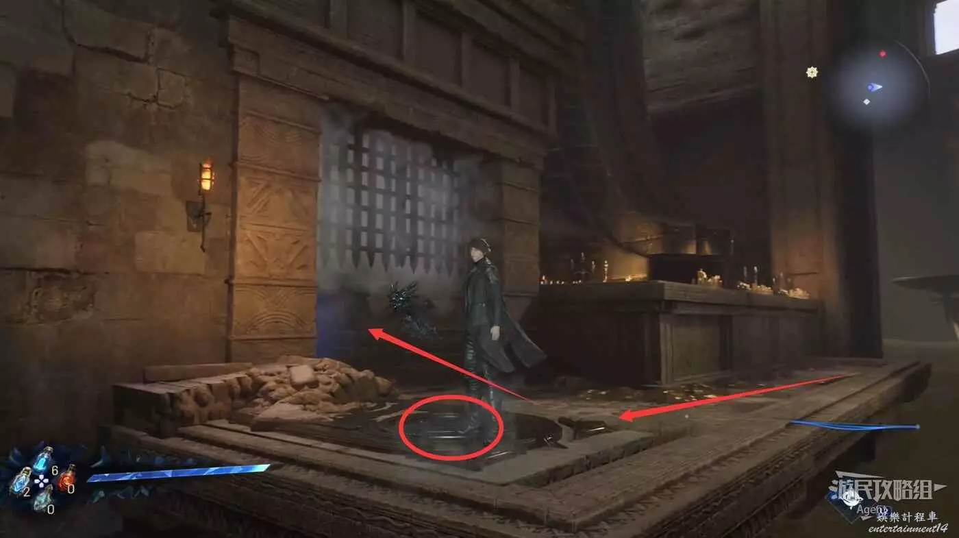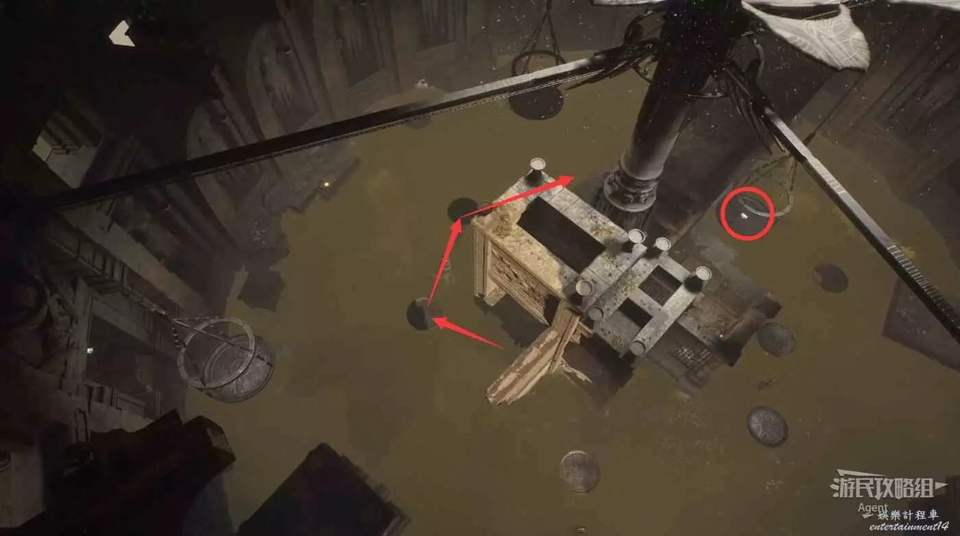 踩按鈕使左邊的秤盤下降後,沿下圖路線跳躍,去踩背面的另一處按鈕。中途的平臺上有寶箱和筆記。