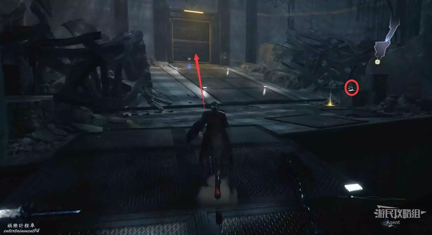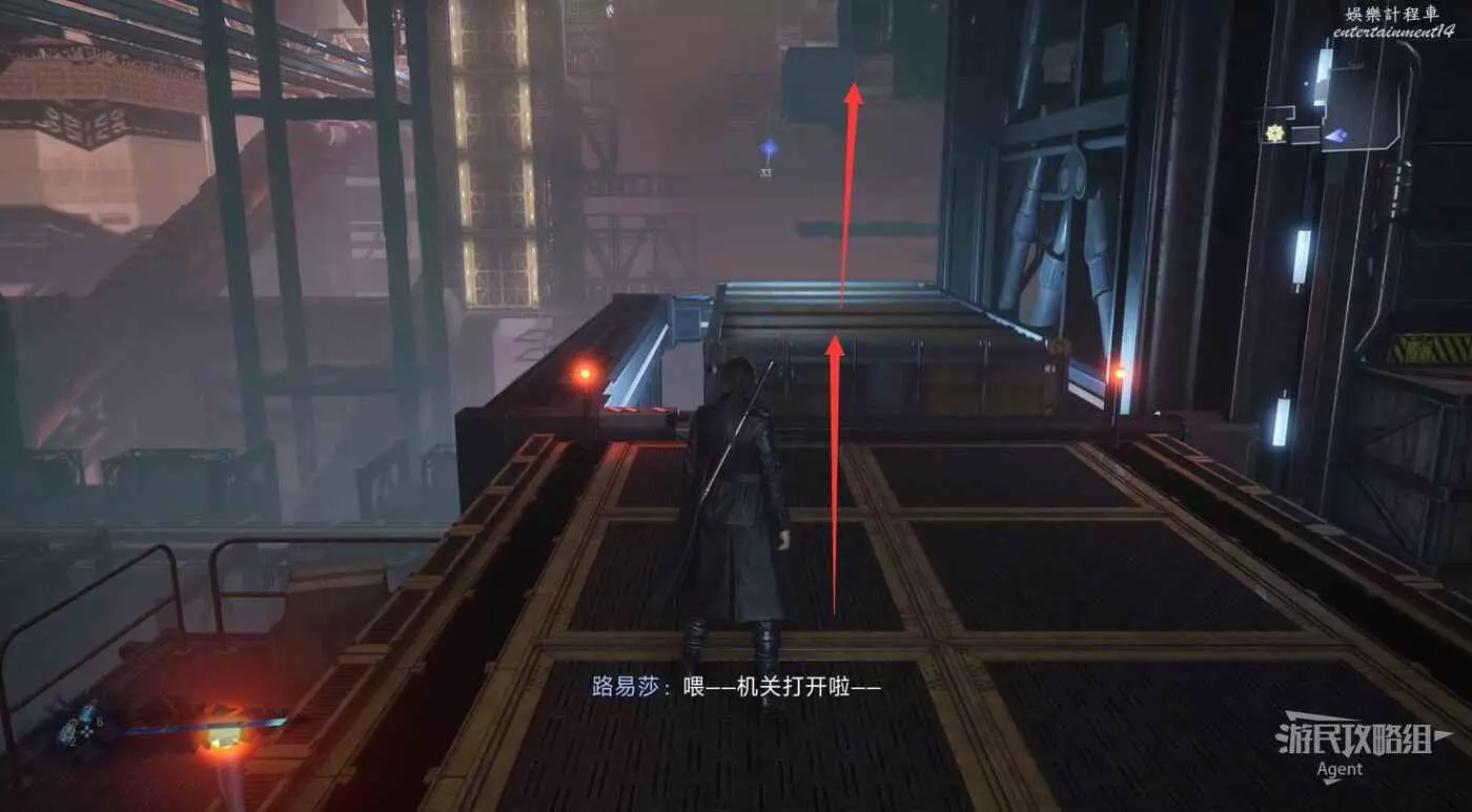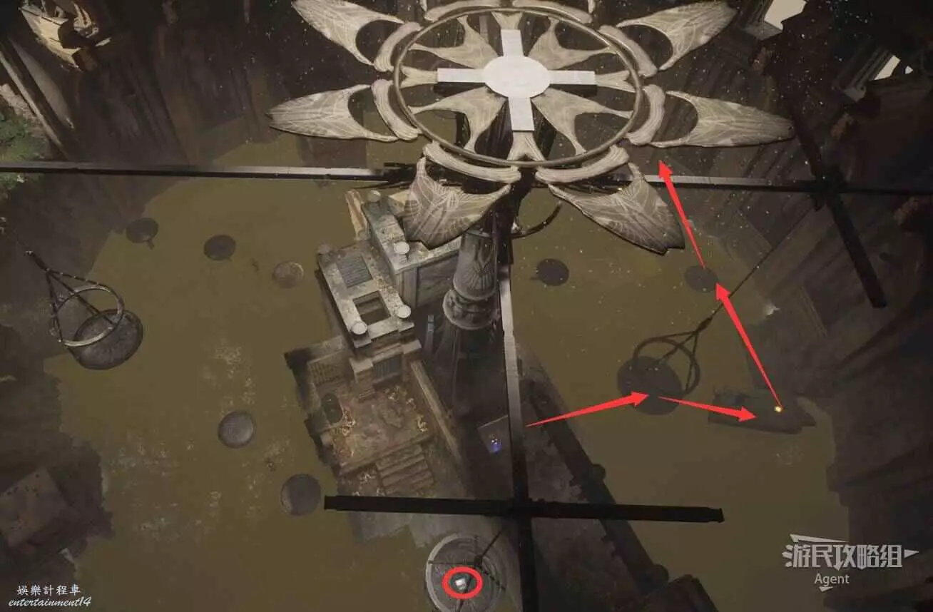 踩按鈕使左邊的秤盤下降後,沿下圖路線跳躍,去踩背面的另一處按鈕。中途的平臺上有寶箱和筆記。