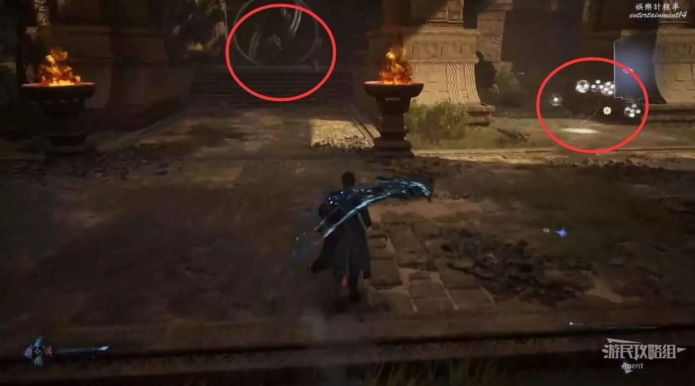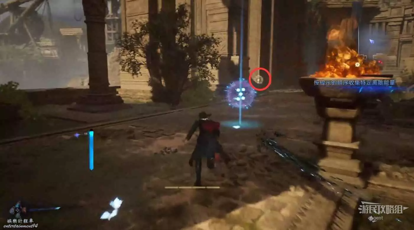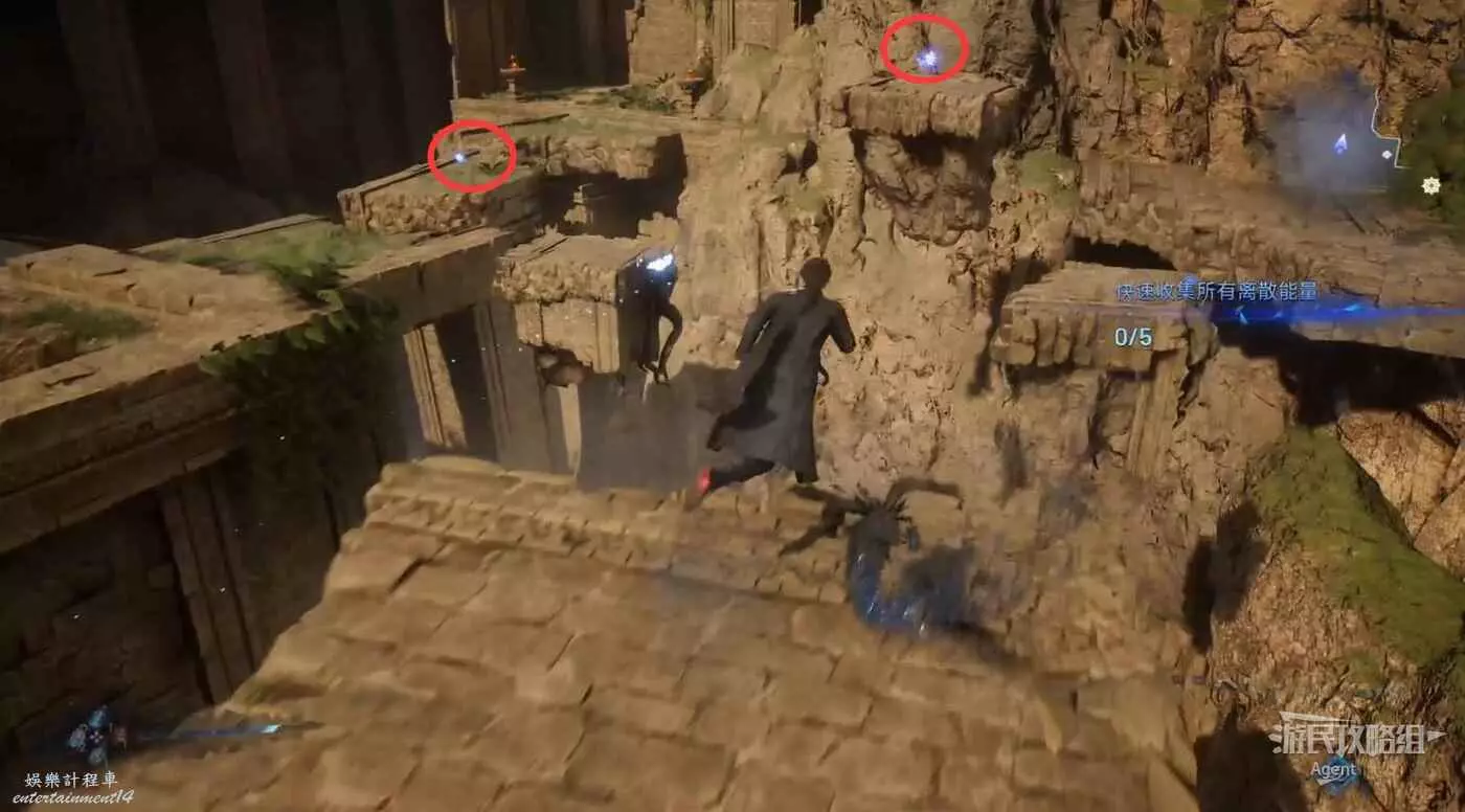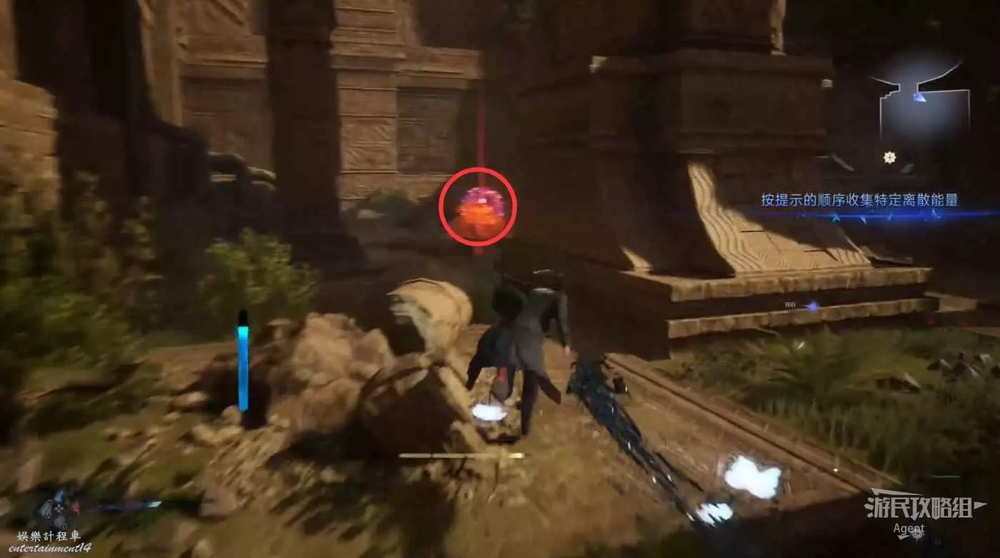 往前走見到藍色光柱,和光柱互動可開啟小挑戰,在限制時間內追上並觸碰光球三次,可獲得技能點經驗值。