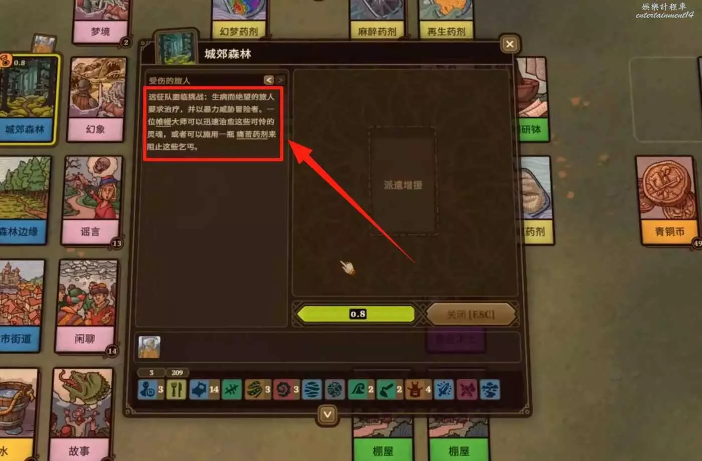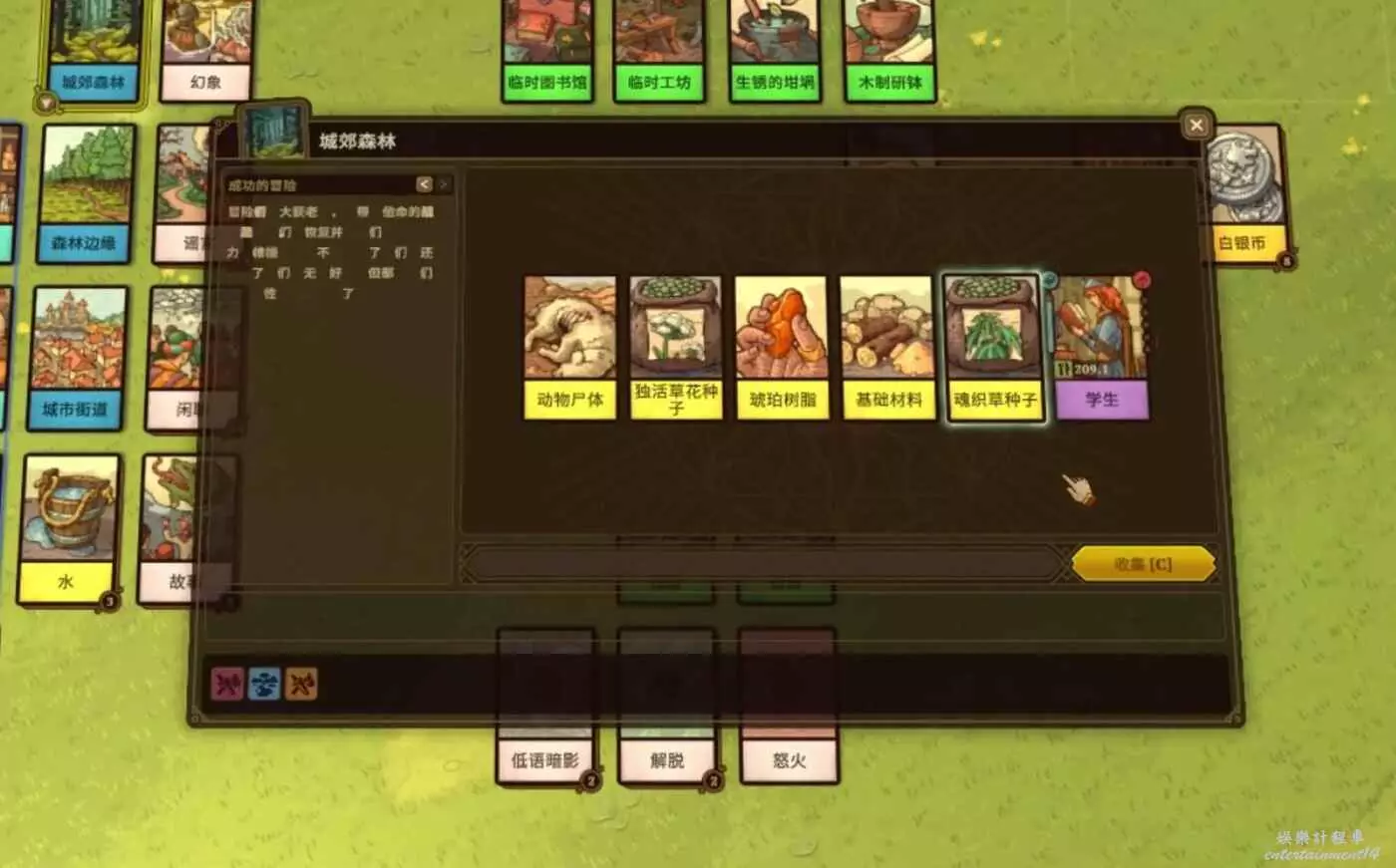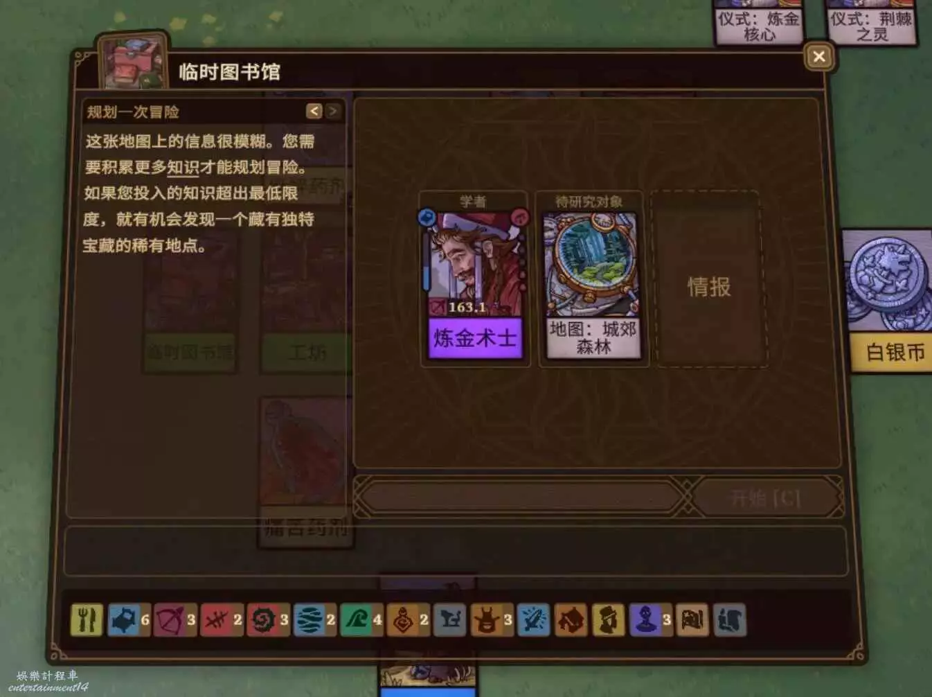 在圖書館詳情頁依次將【煉金術師】和【地圖:城郊森林】都放到槽位裡,此時會發現缺少【情報】。