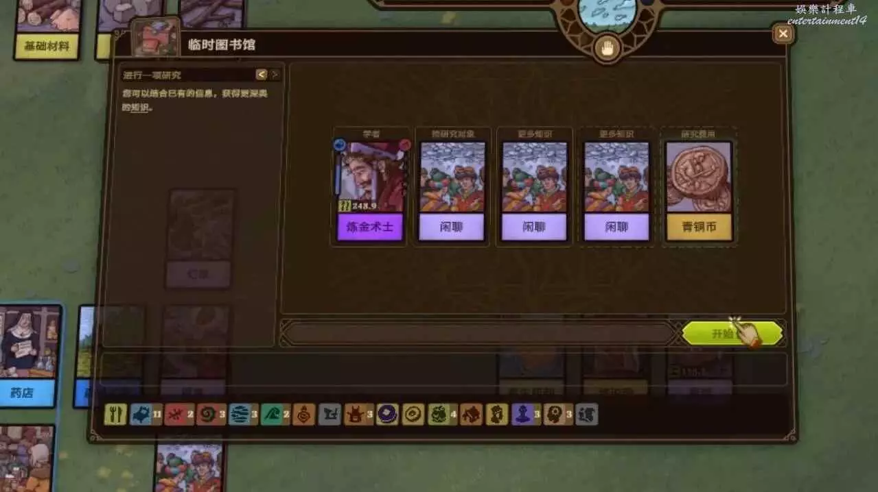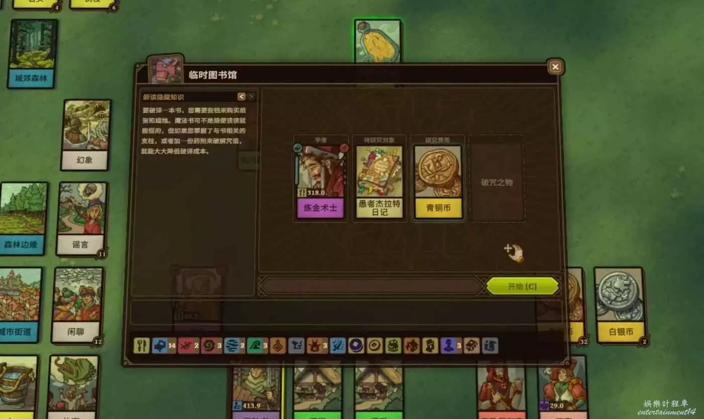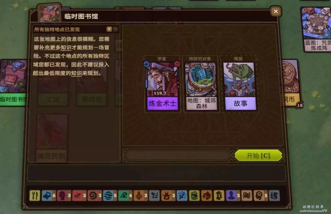臨時圖書館主要可研究三方面內容,首先是最重要的研究地圖,您需要將【煉金術師】、【地圖】和情報卡依次填充到卡槽裡。