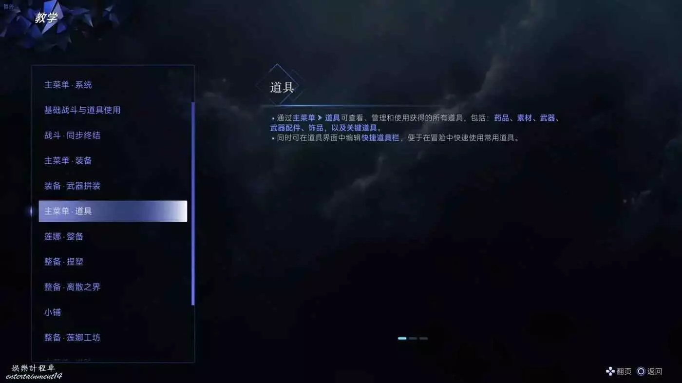 ·通過主功能表>道具可查看、管理和使用獲得的所有道具,包括:藥品、素材、武器、武器配件、飾品,以及關鍵道具。