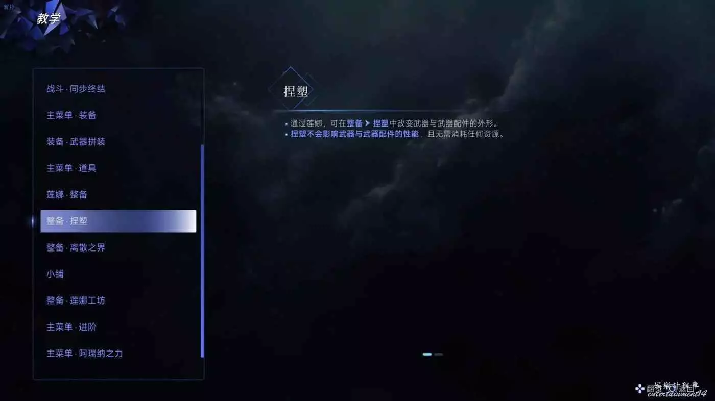 ·每當獲得新的武器或武器配件時,蓮娜會將它們的外觀資訊記錄至捏塑庫中。