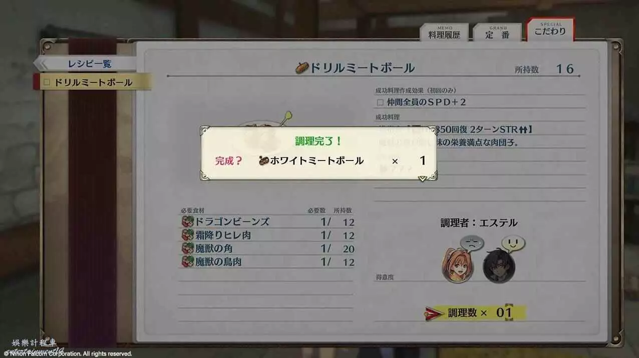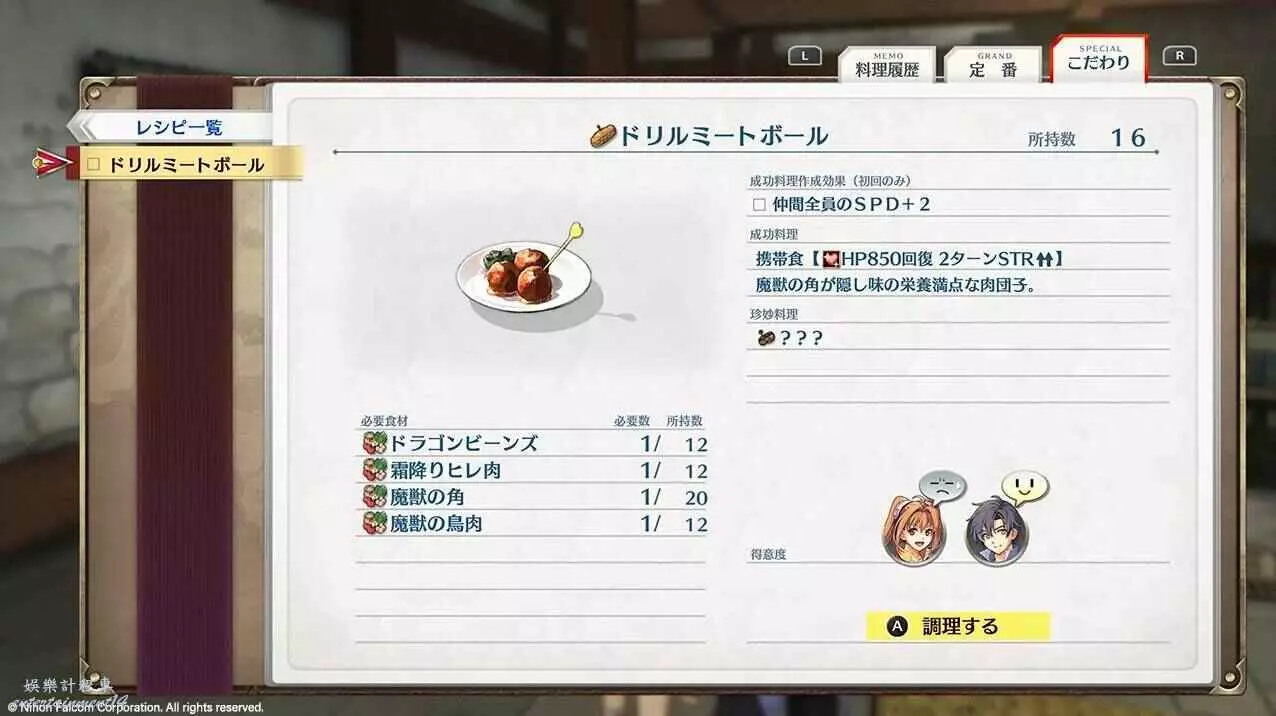 製作各種料理時,“僅限首次”會賦予隊伍全員能力提升等各種各樣的特殊效果!