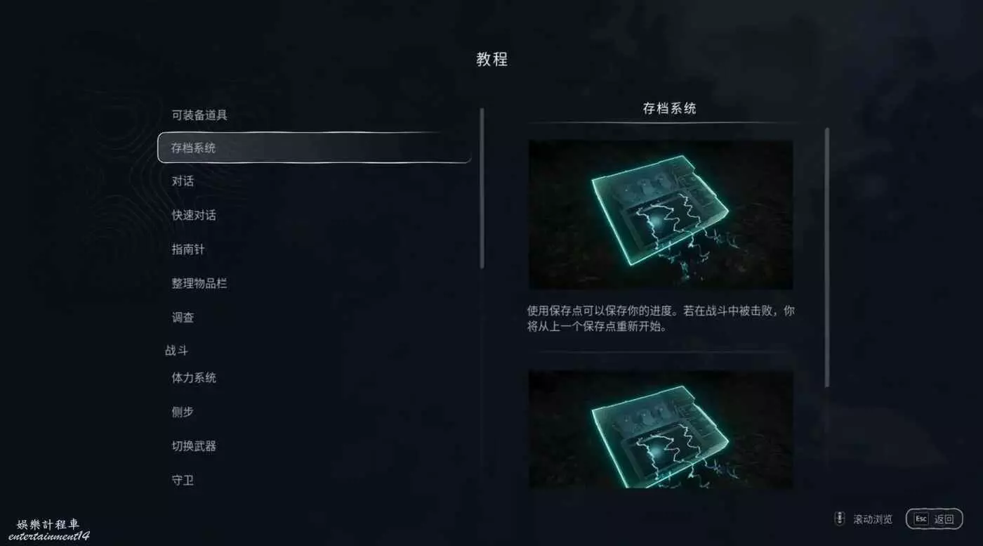 保存內容包括對話、已發現的資訊條目、已完成的謎題、被消滅的敵人、武器進度和收集的戰利品。