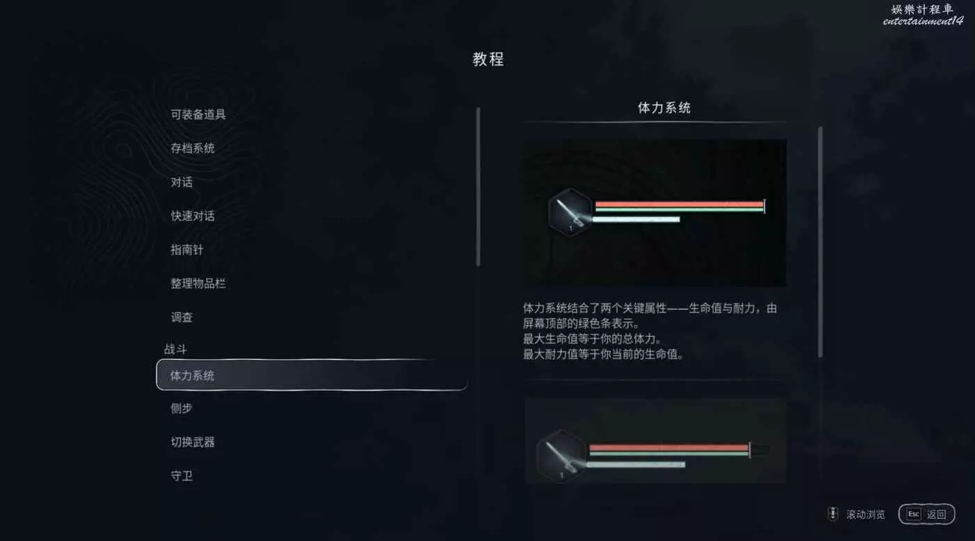 體力系統結合了兩個關鍵屬性一一生命值與耐力,由螢幕頂部的綠色條表示。