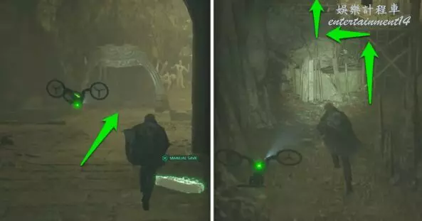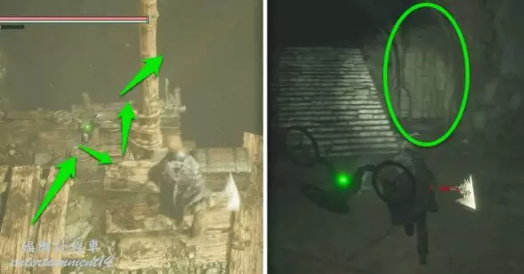 通過壓力板謎題房間後,進入另一個充滿隱藏房間的大廳。從拱門下穿過,爬上腳手架至高處。
