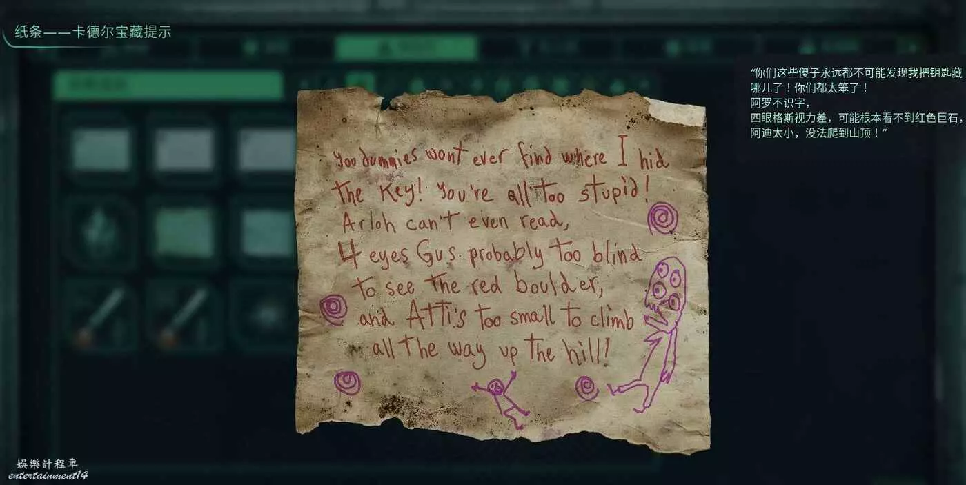 Hell is Us (地獄即我們) 卡德爾家族寶藏謎題接取方法 3 9 月 2025-09-03 廣告 來源:互聯網 玩家在開局不久後進入塞內德拉森林,就可以在一輛裝甲車旁邊看到受傷的士兵。 過去與受傷士兵交談後,他會委託玩家根據西側森林樹幹上的X標記尋找醫療包。 然後往前走到倒下的樹幹左側,前方會出現頂部有黃色閃光的石堆。 走到石堆的旁邊,靠近與石堆互動就能獲得卡德爾寶藏的謎題線索。 寶藏提示: “你們這些傻子永遠都不可能發現我把鑰匙藏哪兒了!你們都太笨了! 阿羅不識字,四眼格斯視力差,可能根本看不到紅色巨石,阿迪太小,沒法爬到山頂!”