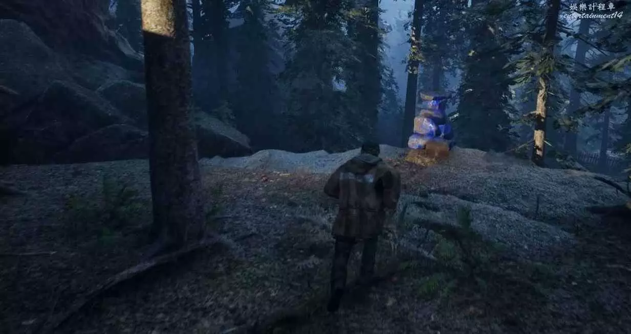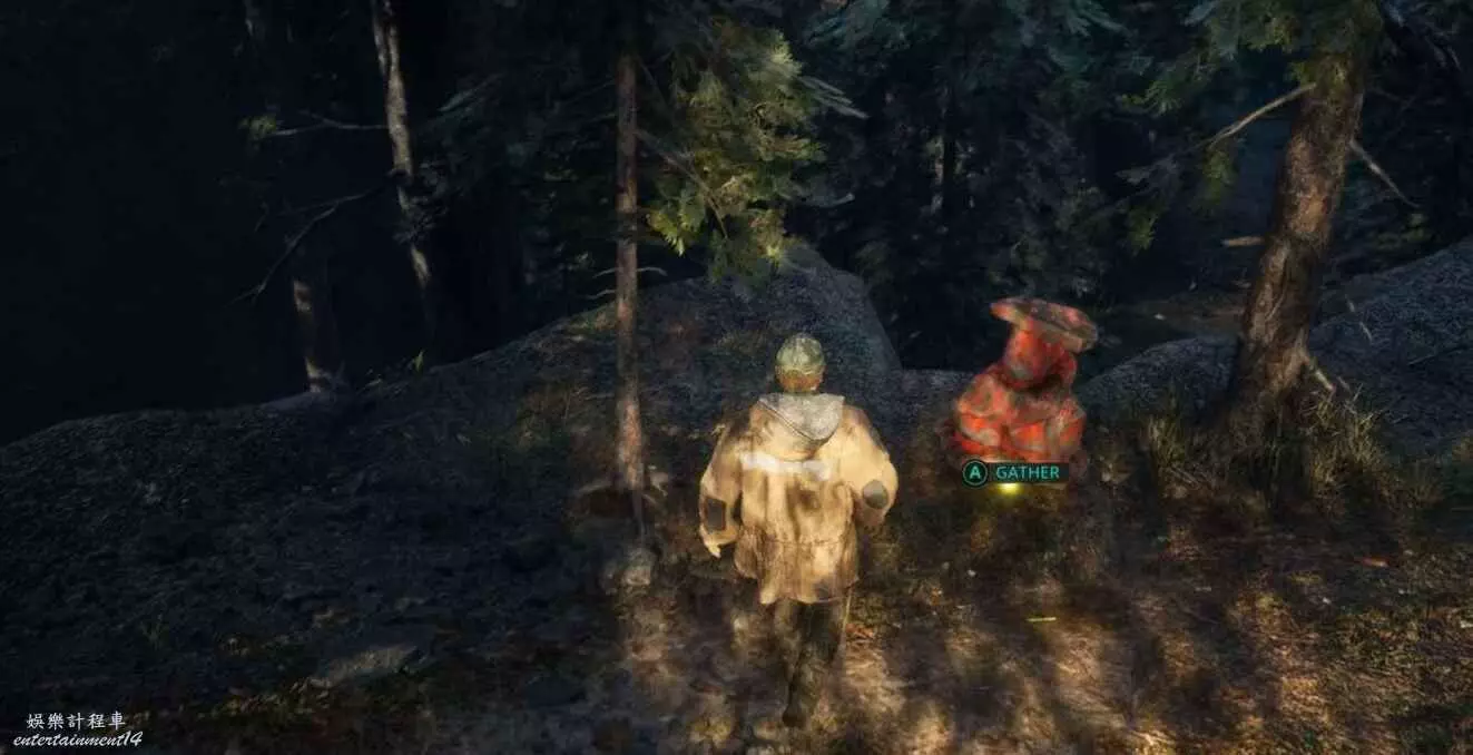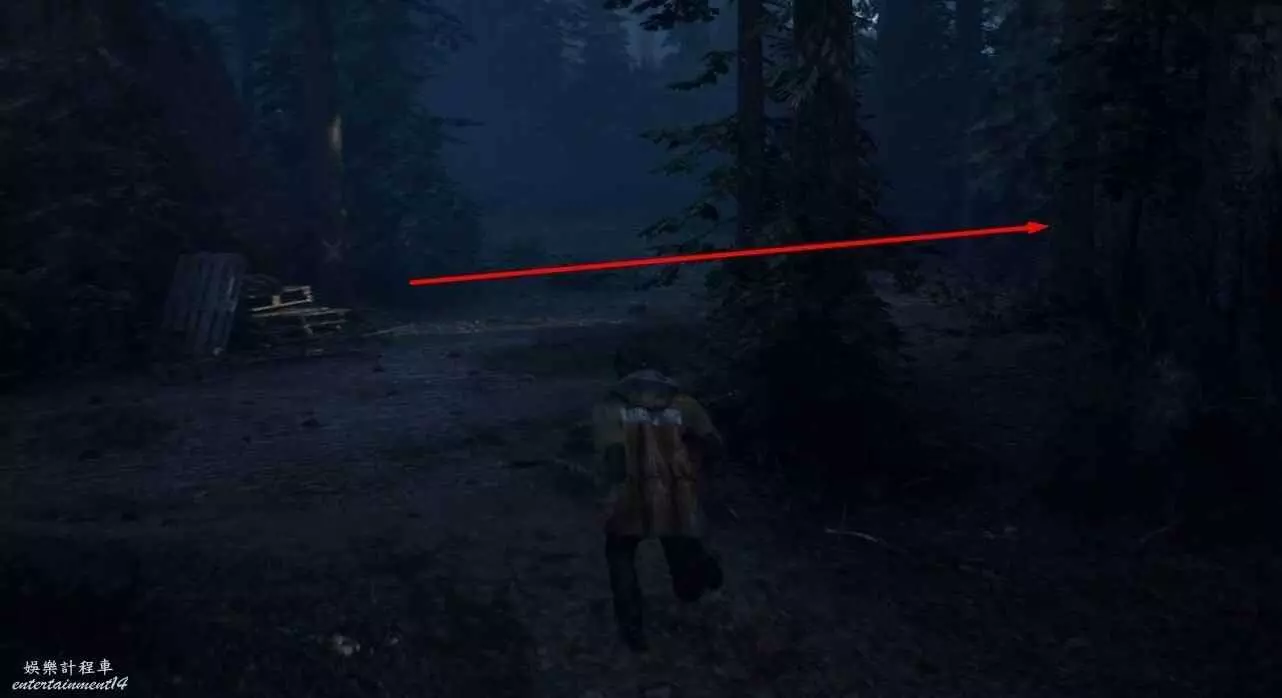 玩家在獲得線索後,沿著上坡路繼續跟隨樹上的X標記前進,直到看見底部標記有X的桶堆。