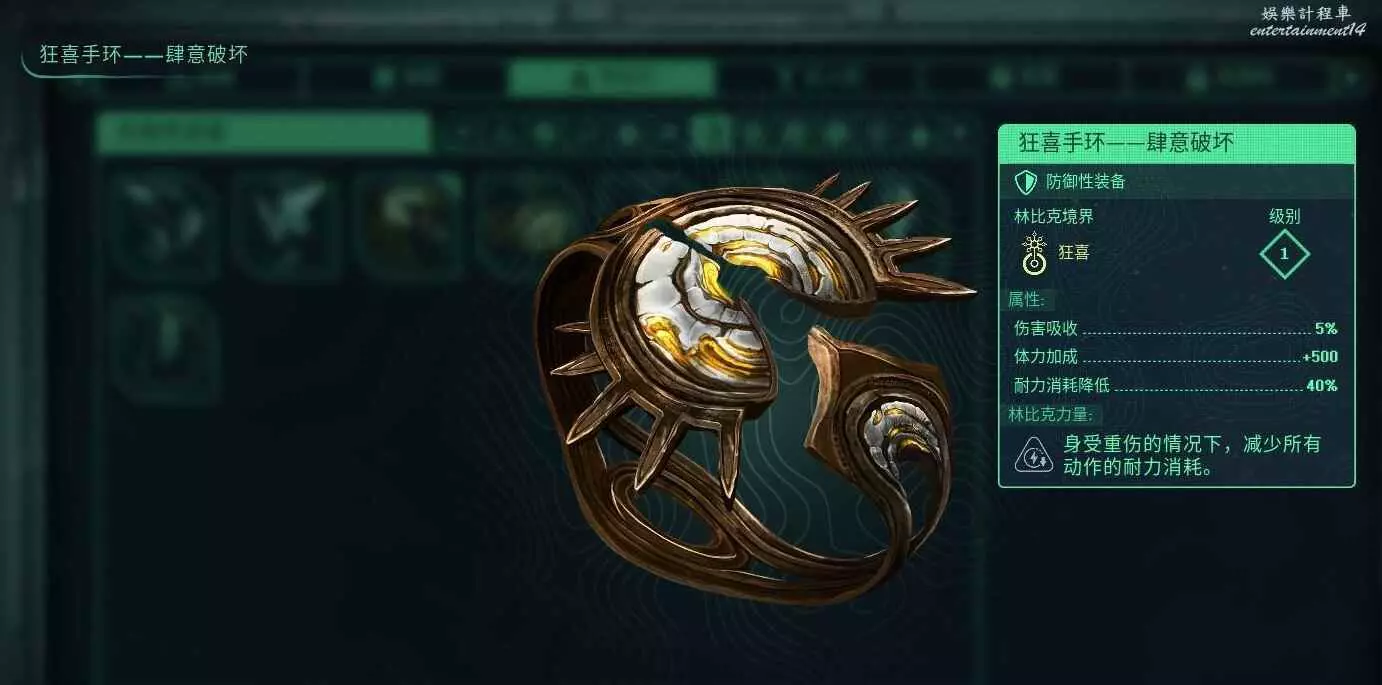 此手環可以裝備在防禦性裝備欄位,提供以下效果:傷害吸收5%、體力加成+500、耐力消耗降低40%。