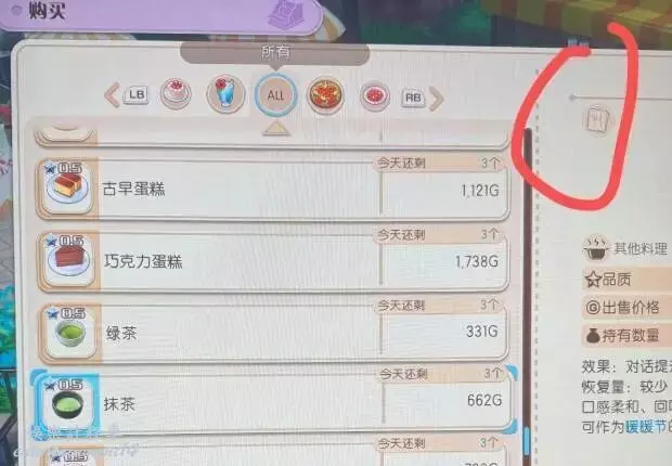 關於食譜,給大家一個小技巧,右上角那個位置,打勾勾了,就是證明你有這個菜譜,沒有的,那就是你需要買了吃,來更新食譜。