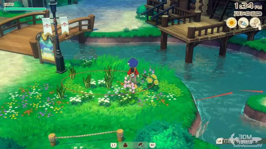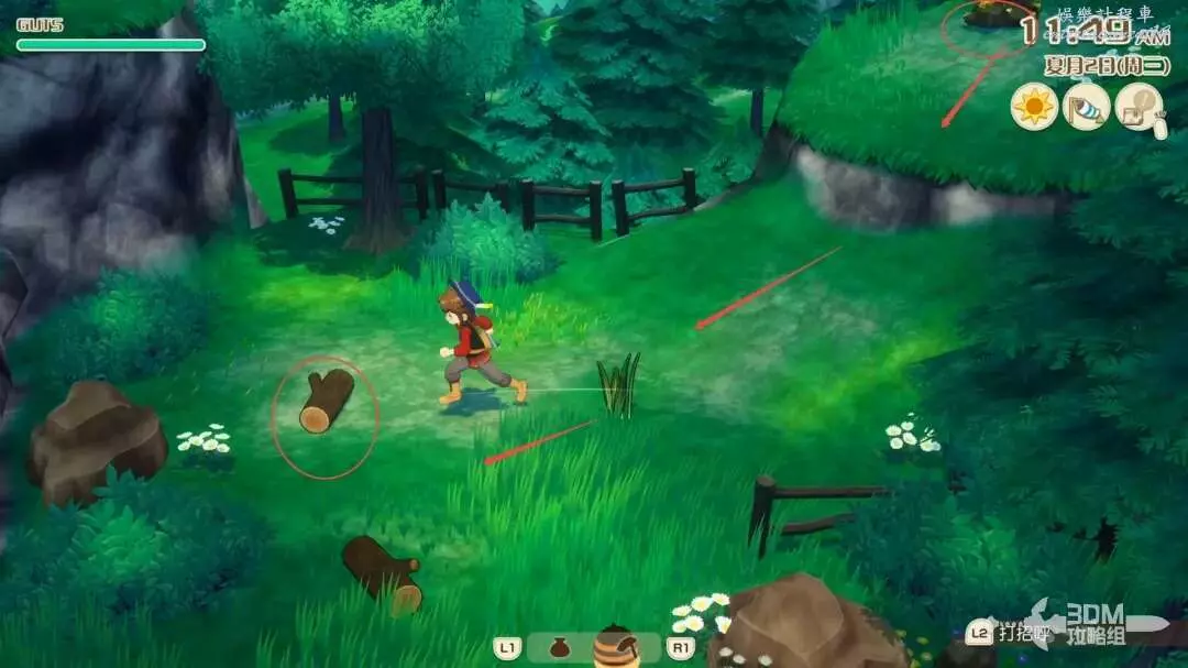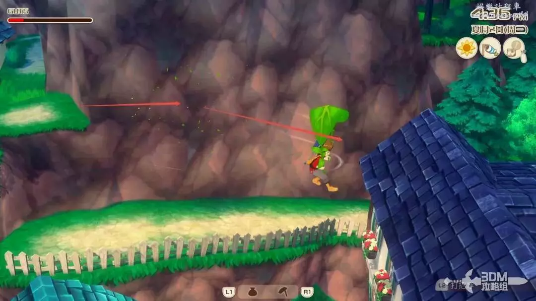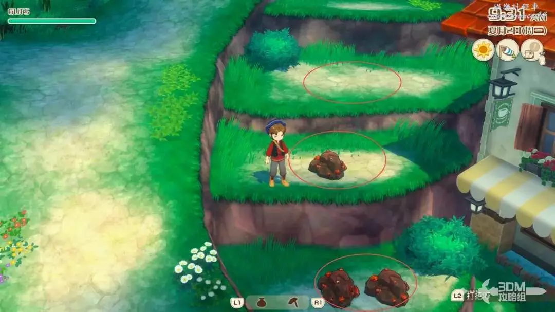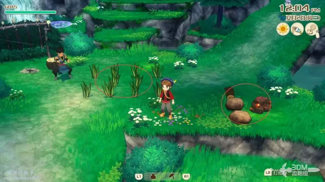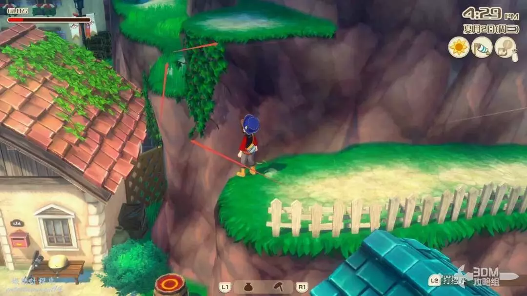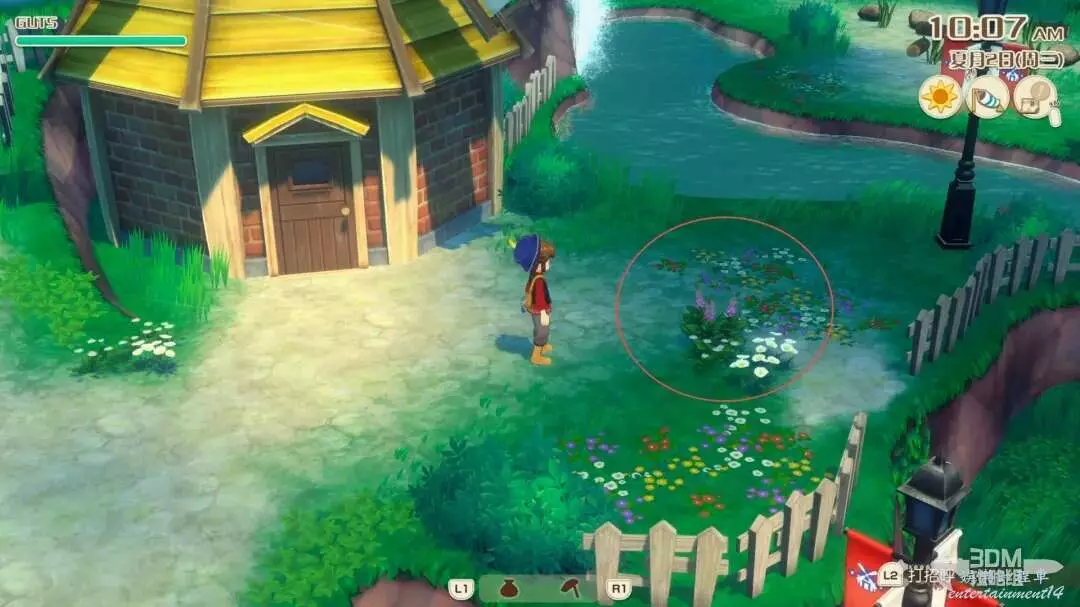 接下來就是家裡紅色風車旁邊,每次都會刷新一堆雜草;可以在這附近找到交採集物的小精靈,用來提升採集物的等級。