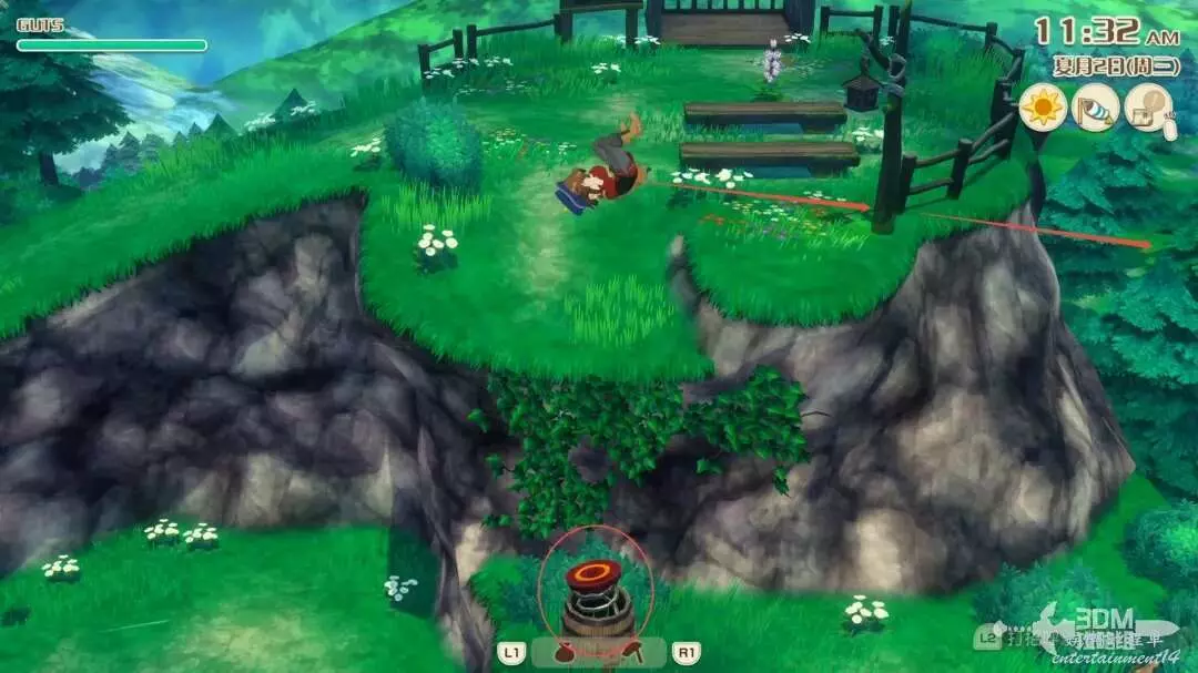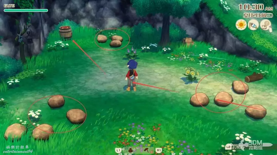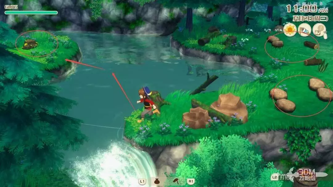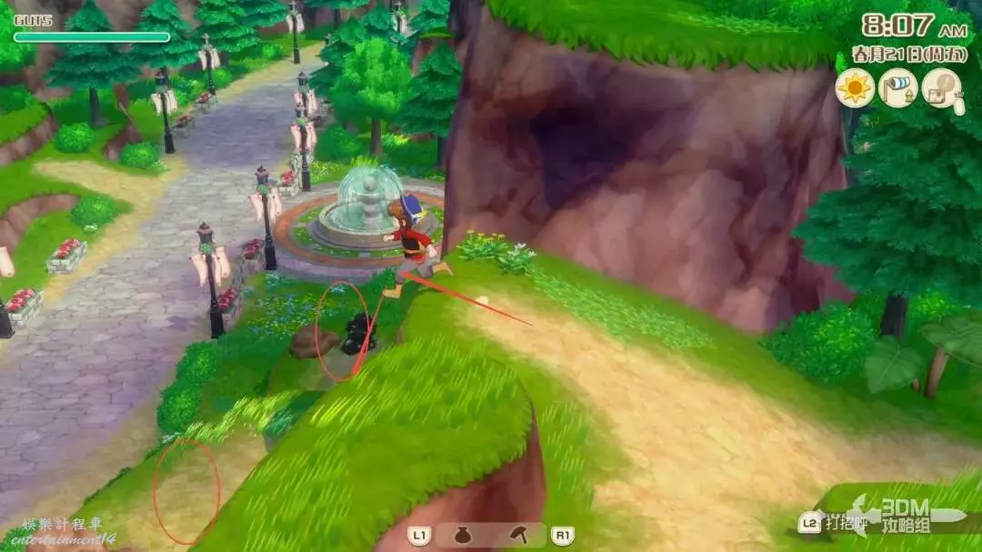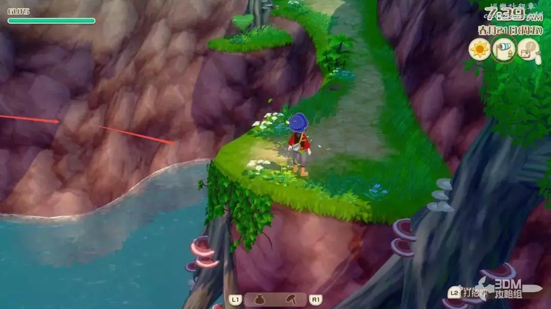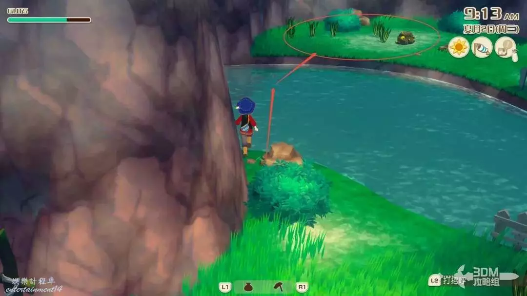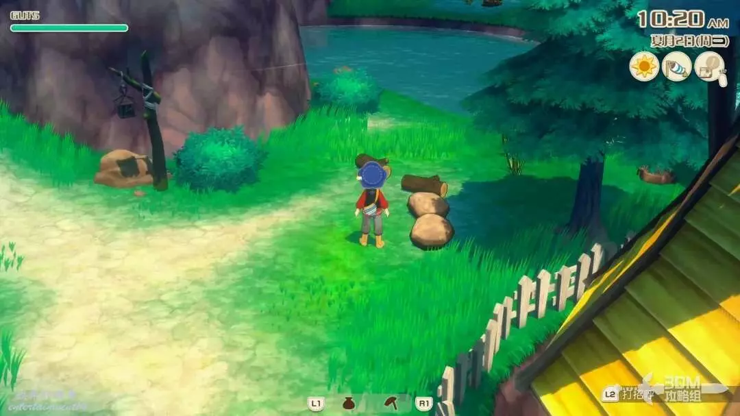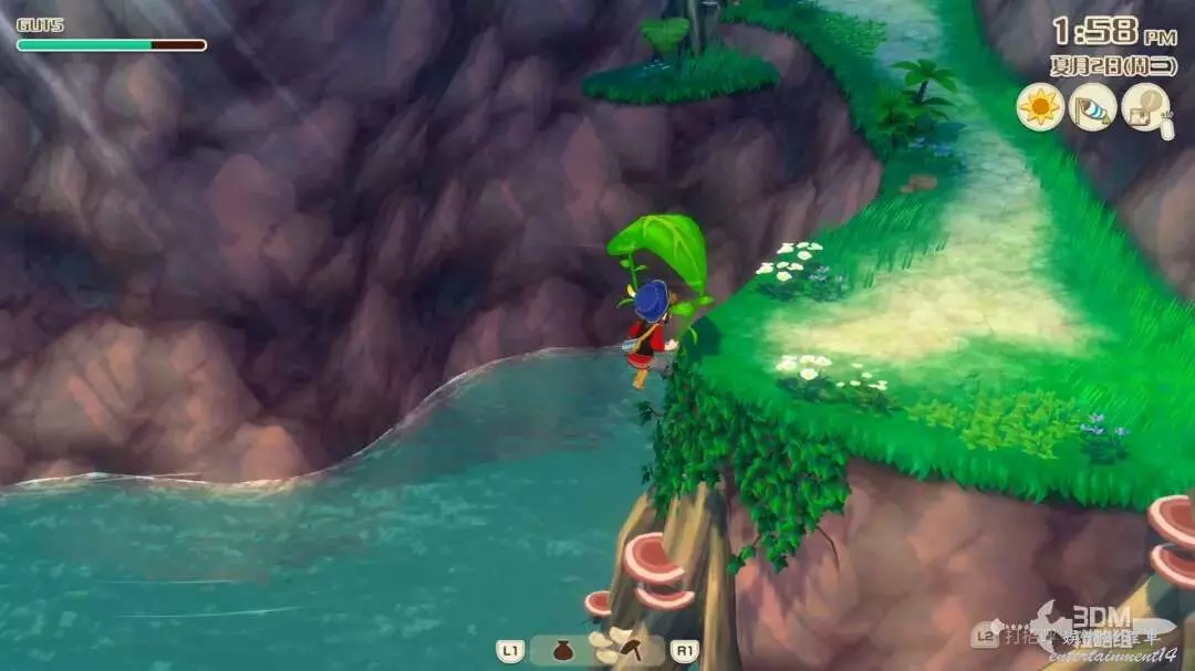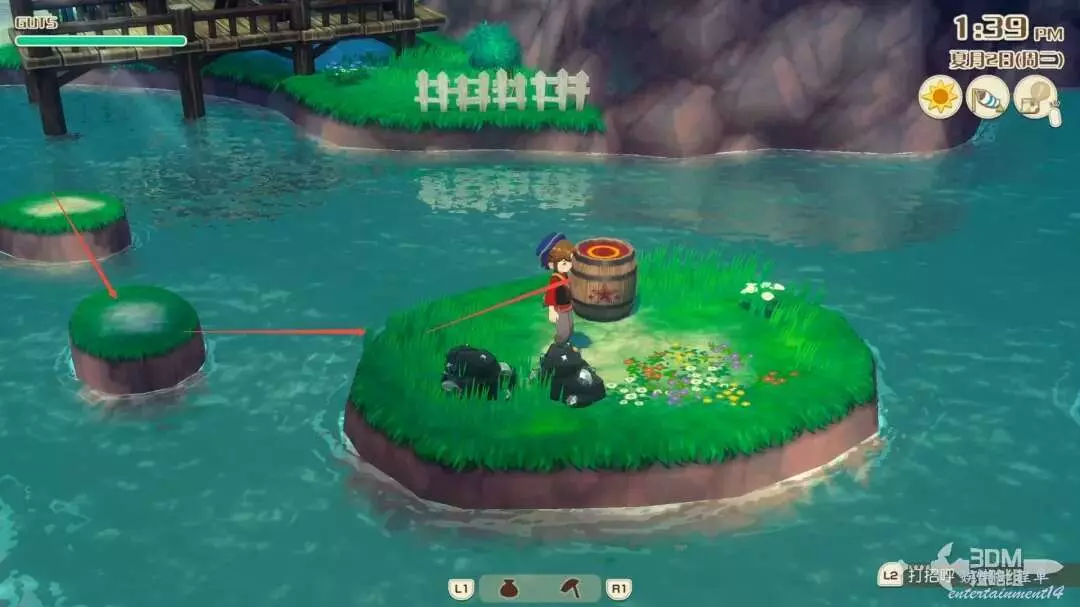 首先沿著河裡凸出的石頭,往右跳,這個湖心島上有一些礦石資源,還會有一個木桶,一定要是大風天氣才能使用此木桶往右滑翔,否則會調入池塘!
