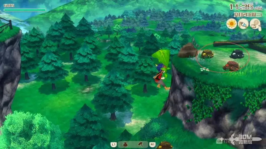 接下來是另一處資源,需要已經解鎖了二段跳和滑翔的能力;使用山頂下面的木桶,彈射起來,在空中打開滑翔傘,朝著右邊滑行(應該需要一點東南風)