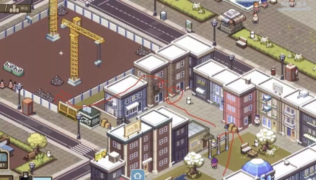 小鎮左側建築工地要從右邊小公園入口繞進去,如下圖紅箭頭。紅圈的地方是隱藏門重點