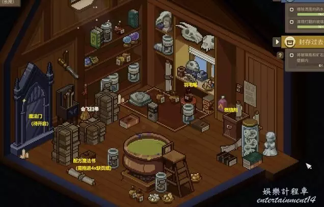地上發現“配方魔法書”是指引我們在這個場景解謎的關鍵。找到房間內地上四片魔法書缺頁拖進魔法書補全它的內容,然後右鍵可互動魔法書查看正確配方。