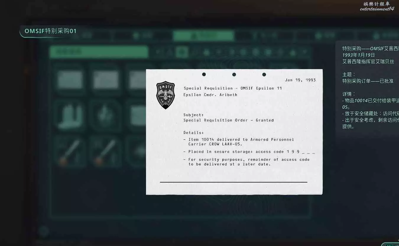 跟隨主線調查離開地下遺跡,進入戰壕區域前,在地下部分可以看到一具屍體,搜索屍體可以獲得【APC鑰匙】,同時拾取探索道具【OMSIF特別採購01】,獲得後三位元密碼301。