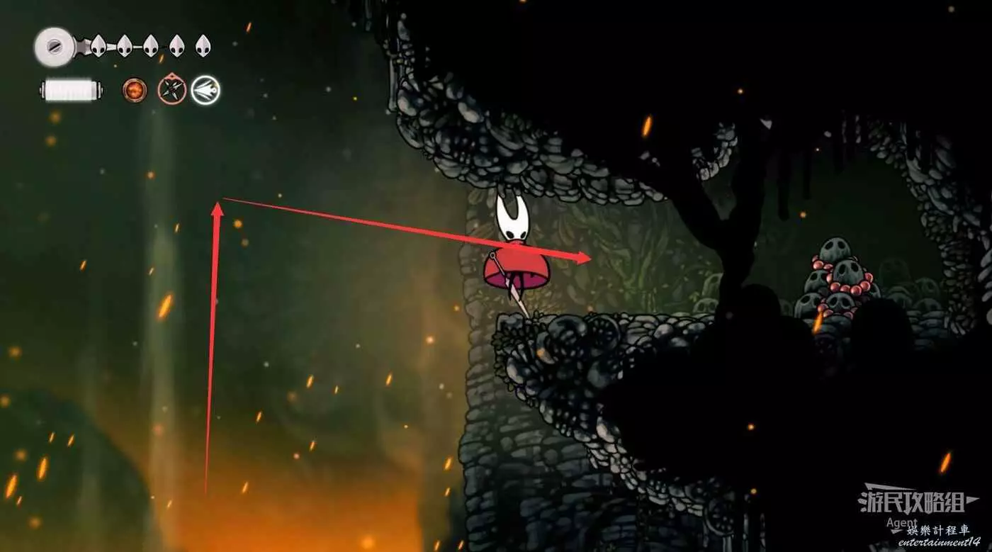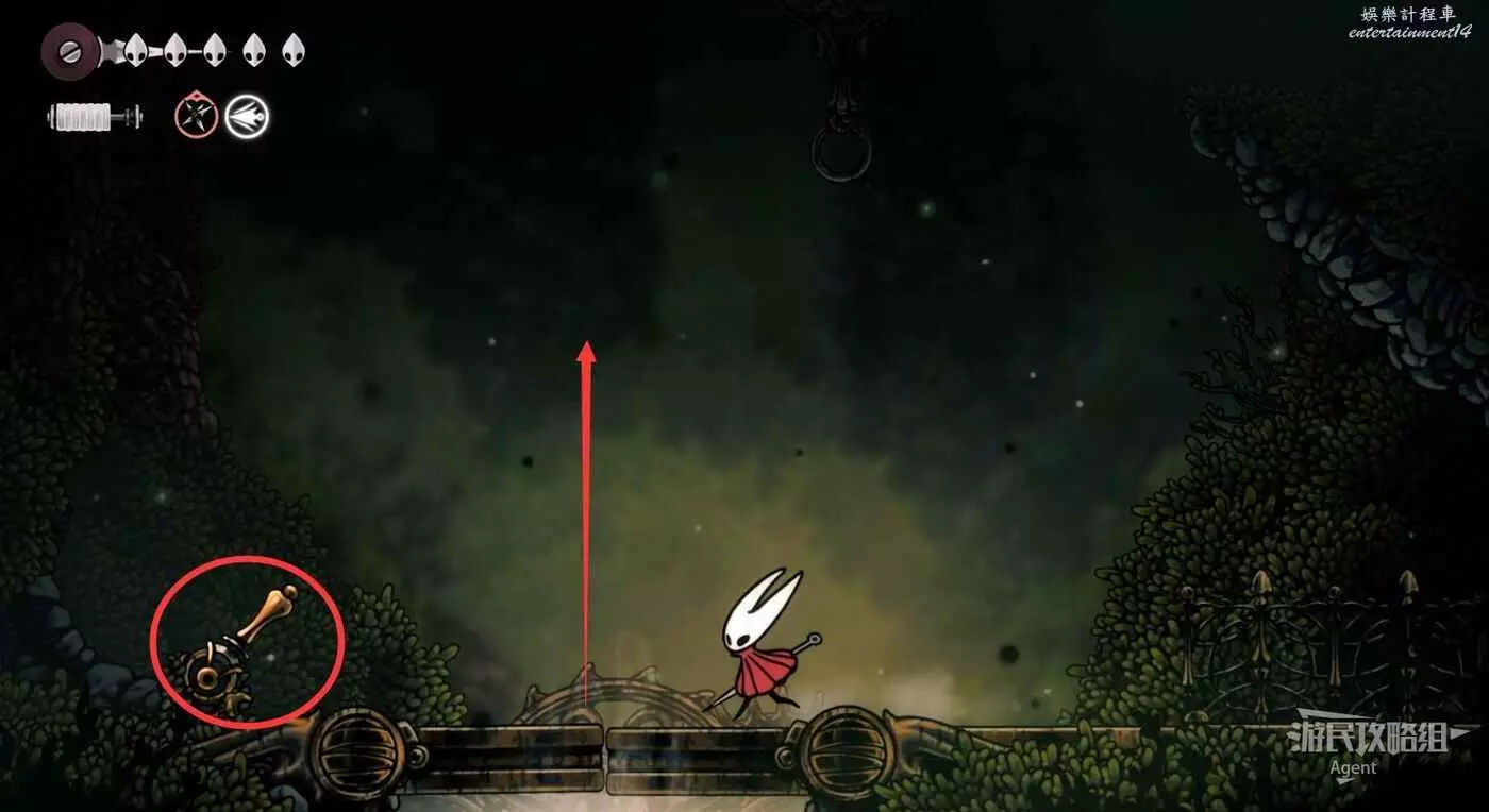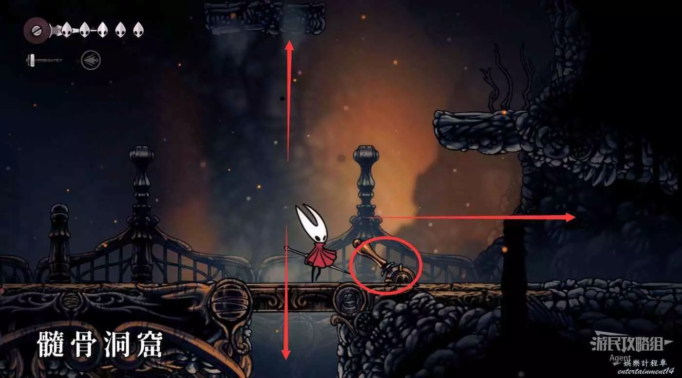 下圖位置有個氣流,隨氣流飛上去,打爆牆壁進去拿到【骨卷軸】。