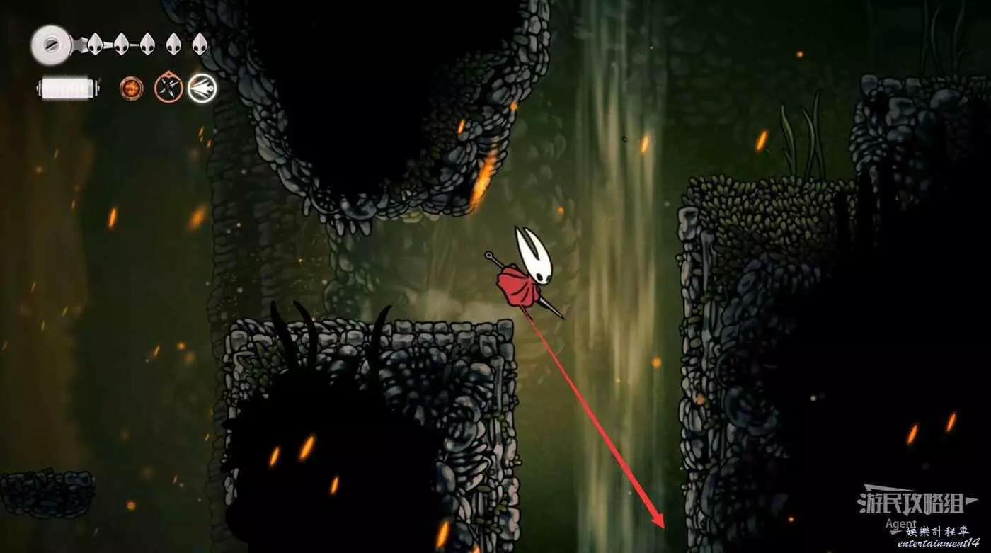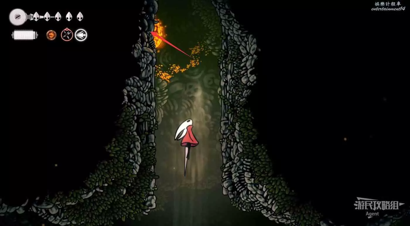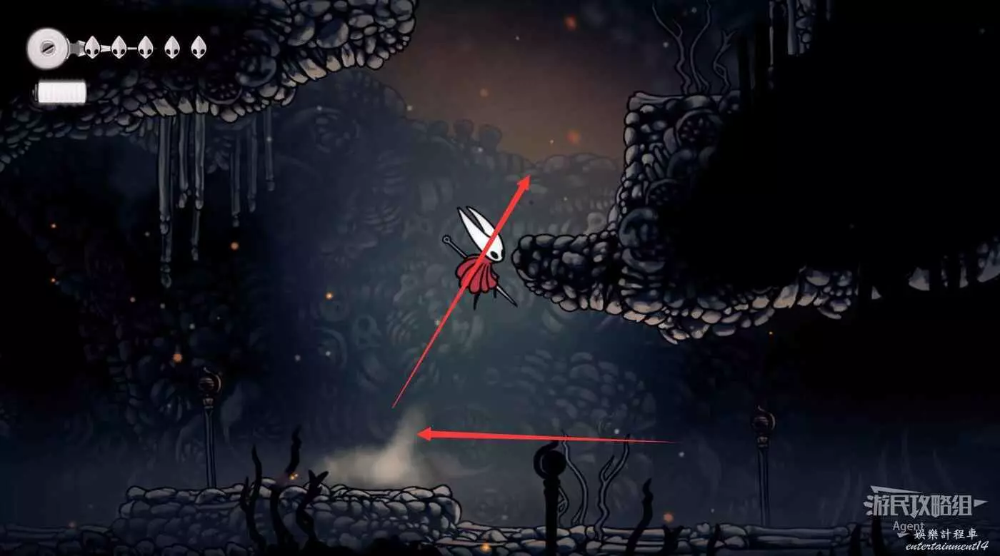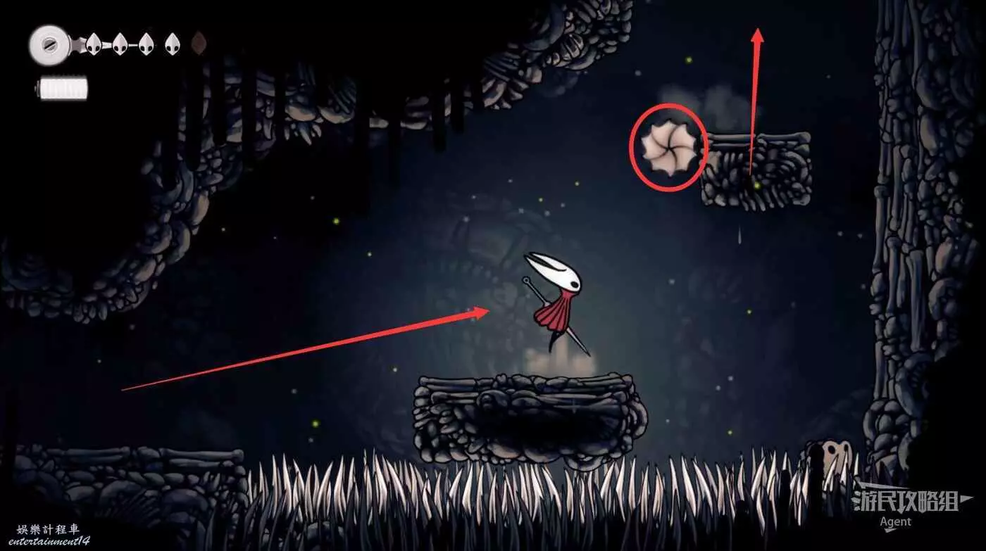 下圖位置有個氣流,隨氣流飛上去,打爆牆壁進去拿到【骨卷軸】。